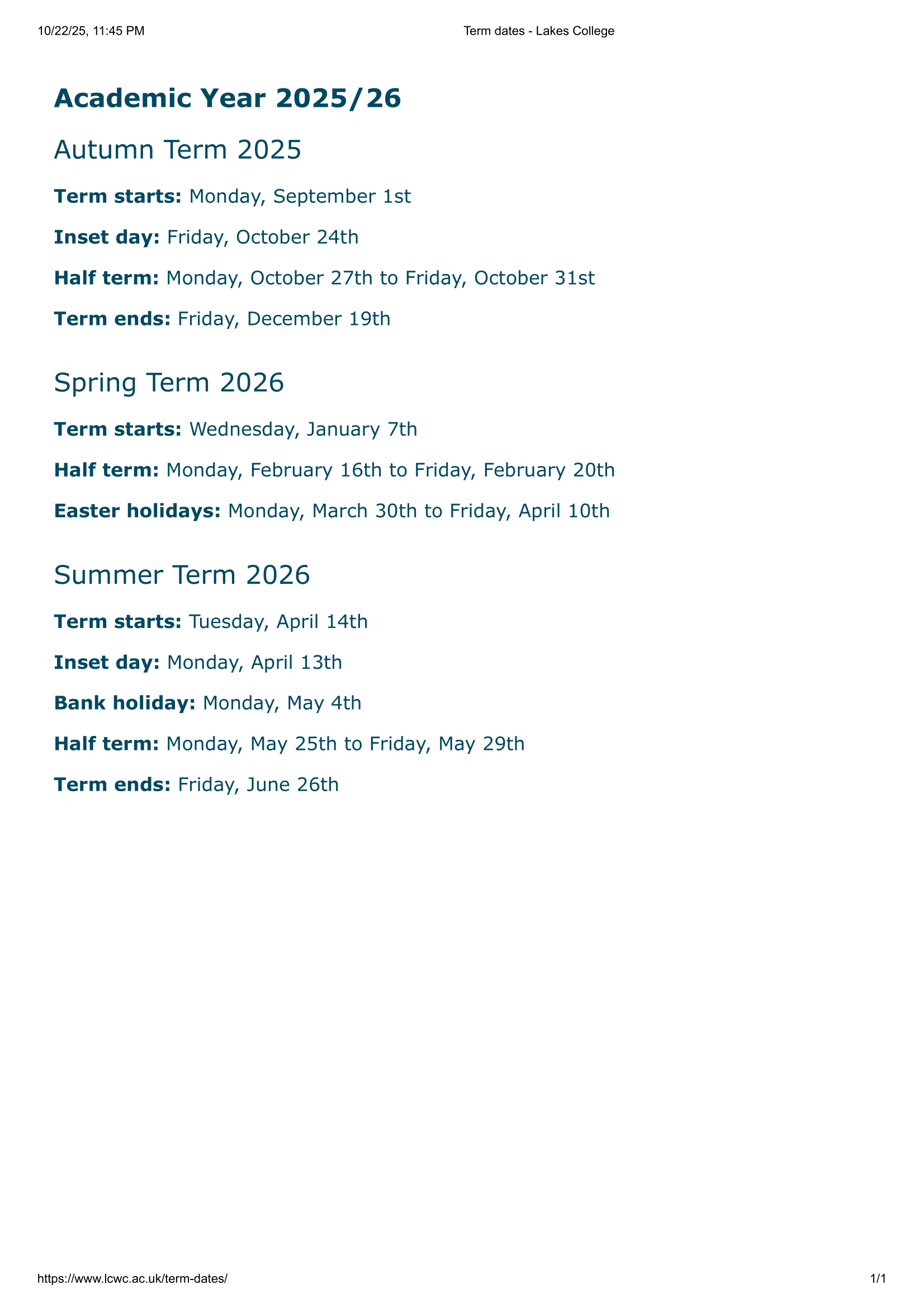 Lakes College – Term Dates FAQ (Academic Year 2025/26)