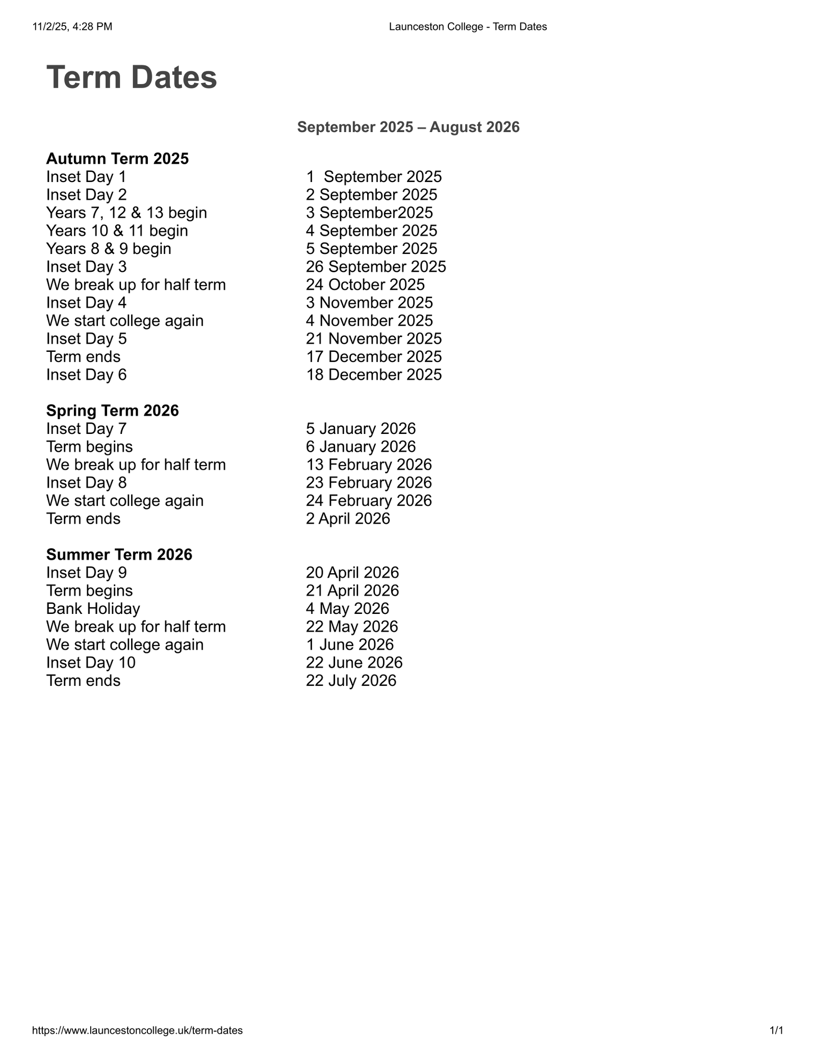 Launceston College Term dates (2025-2026)