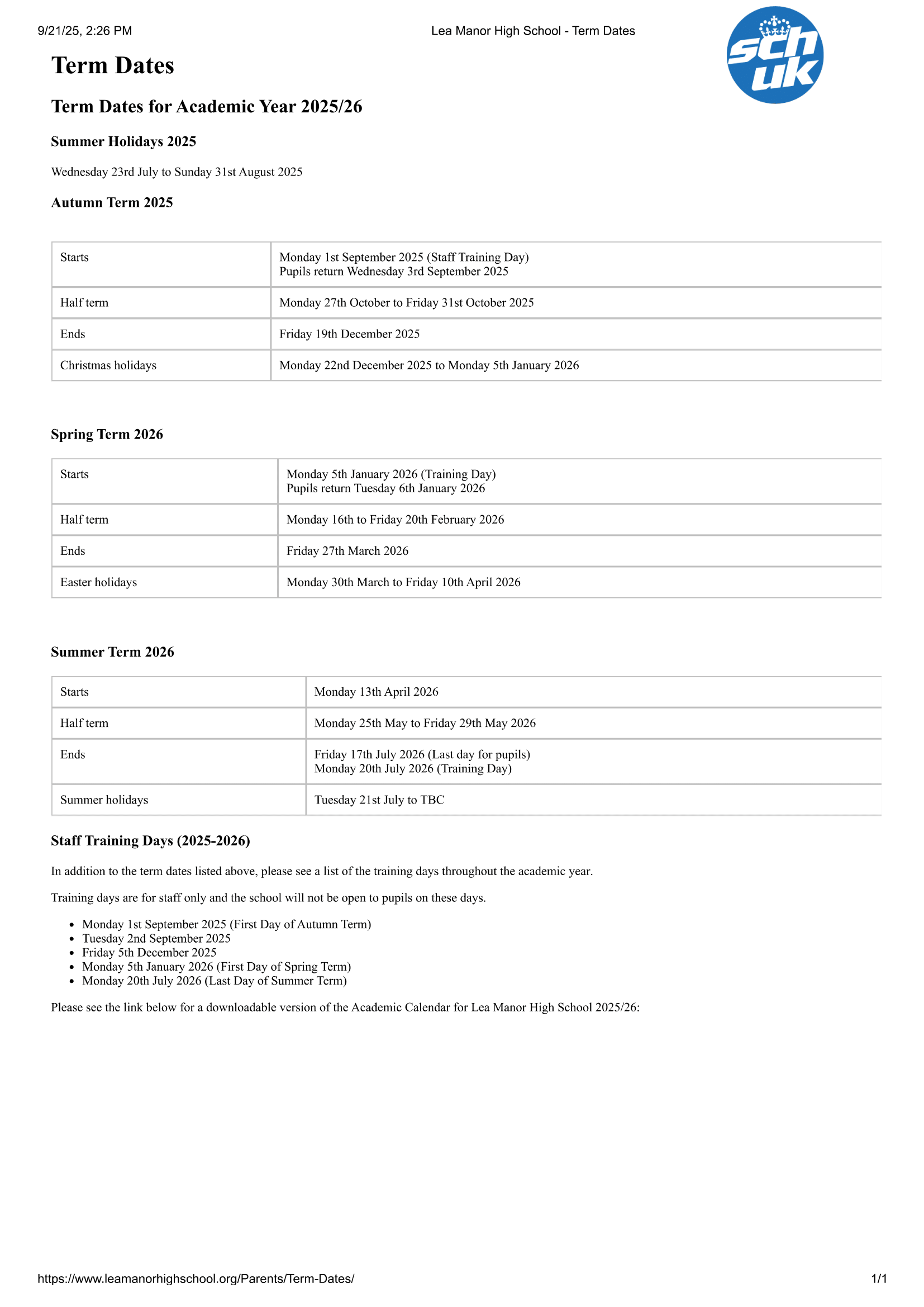 Lea Manor High School term dates page: https://www.leamanorhighschool.org/Parents/Term-Dates/