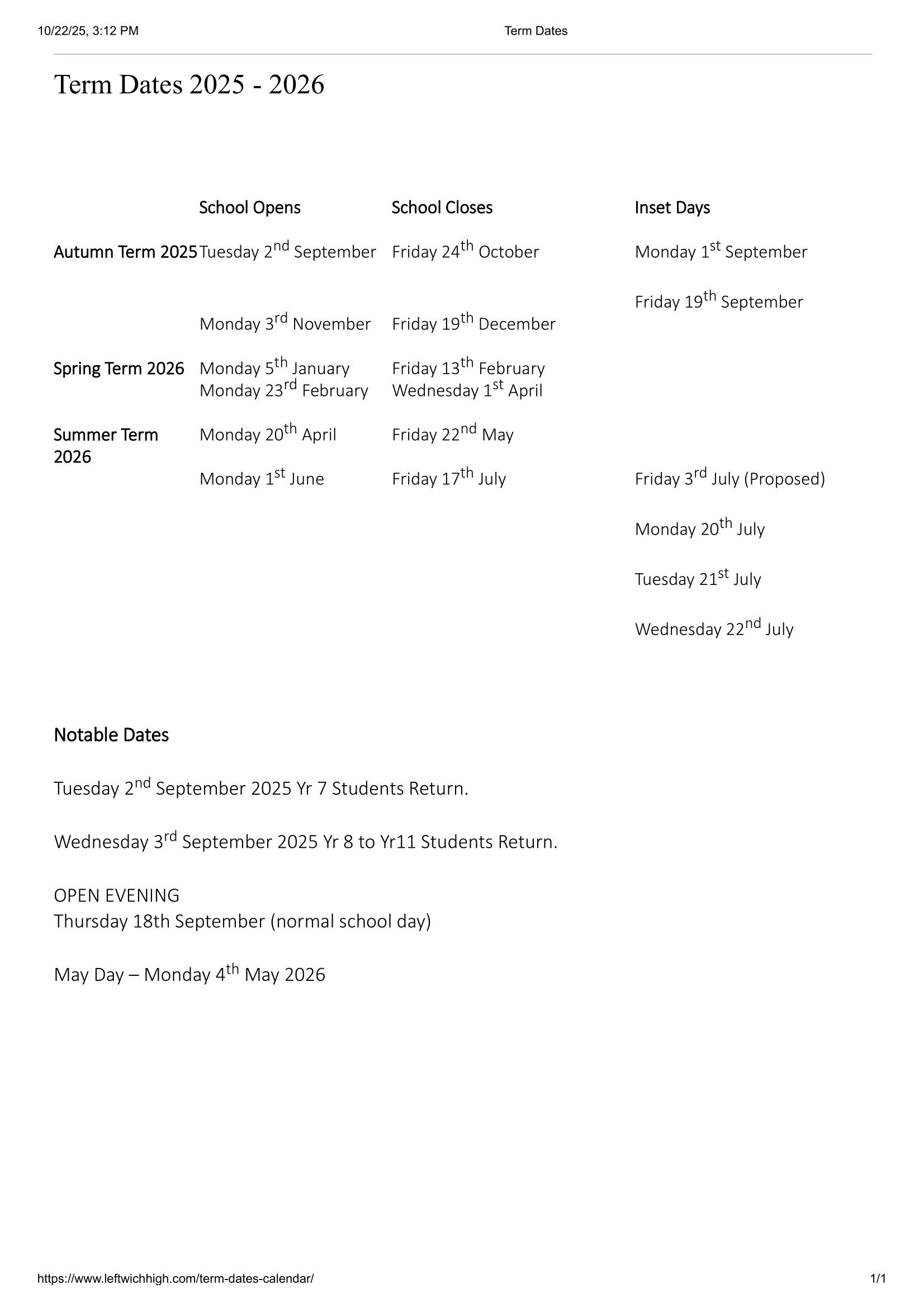 The school Term Dates shown on this page has been sourced directly from the official Leftwich High School Term Dates 25-26 Official website. Please be aware that all dates and events may be amended at the discretion of the school or local council. For the most up-to-date and accurate information, we recommend checking the official council website or contacting the school office.