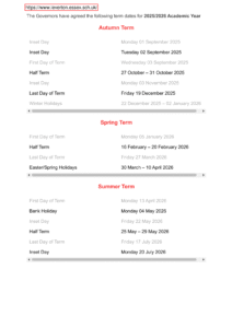 - Inset Days: Monday 01 September 2025, Tuesday 02 September 2025, Monday 03 November 2025, Friday 22 May 2026, Monday 20 July 2026.