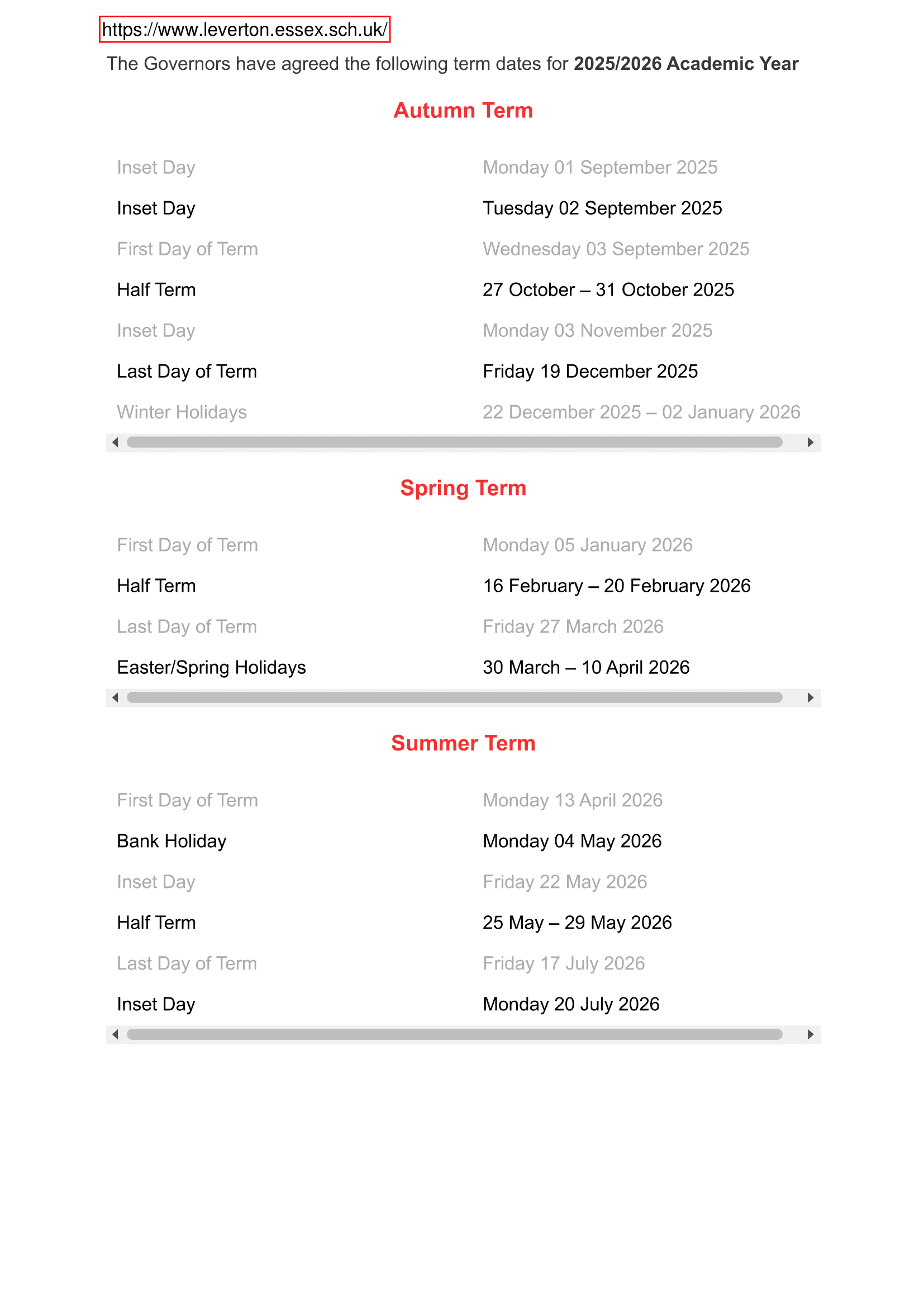 The school Term Dates shown on this page has been sourced directly from the official Leverton Primary School term dates website. Please be aware that all dates and events may be amended at the discretion of the school or local council. For the most up-to-date and accurate information, we recommend checking the official council website or contacting the school office.