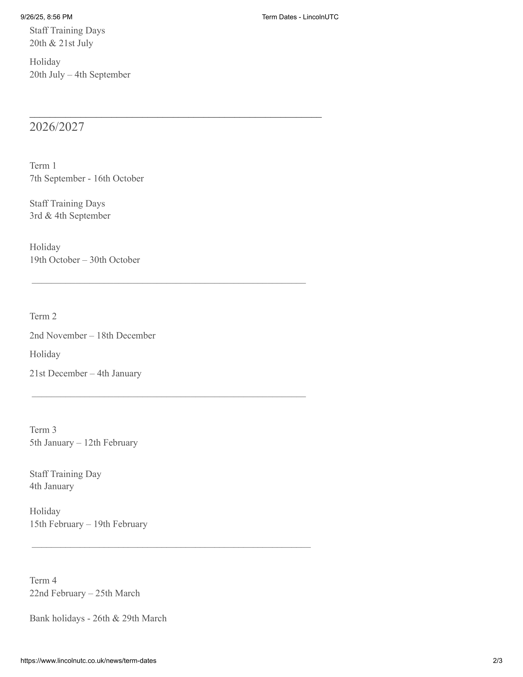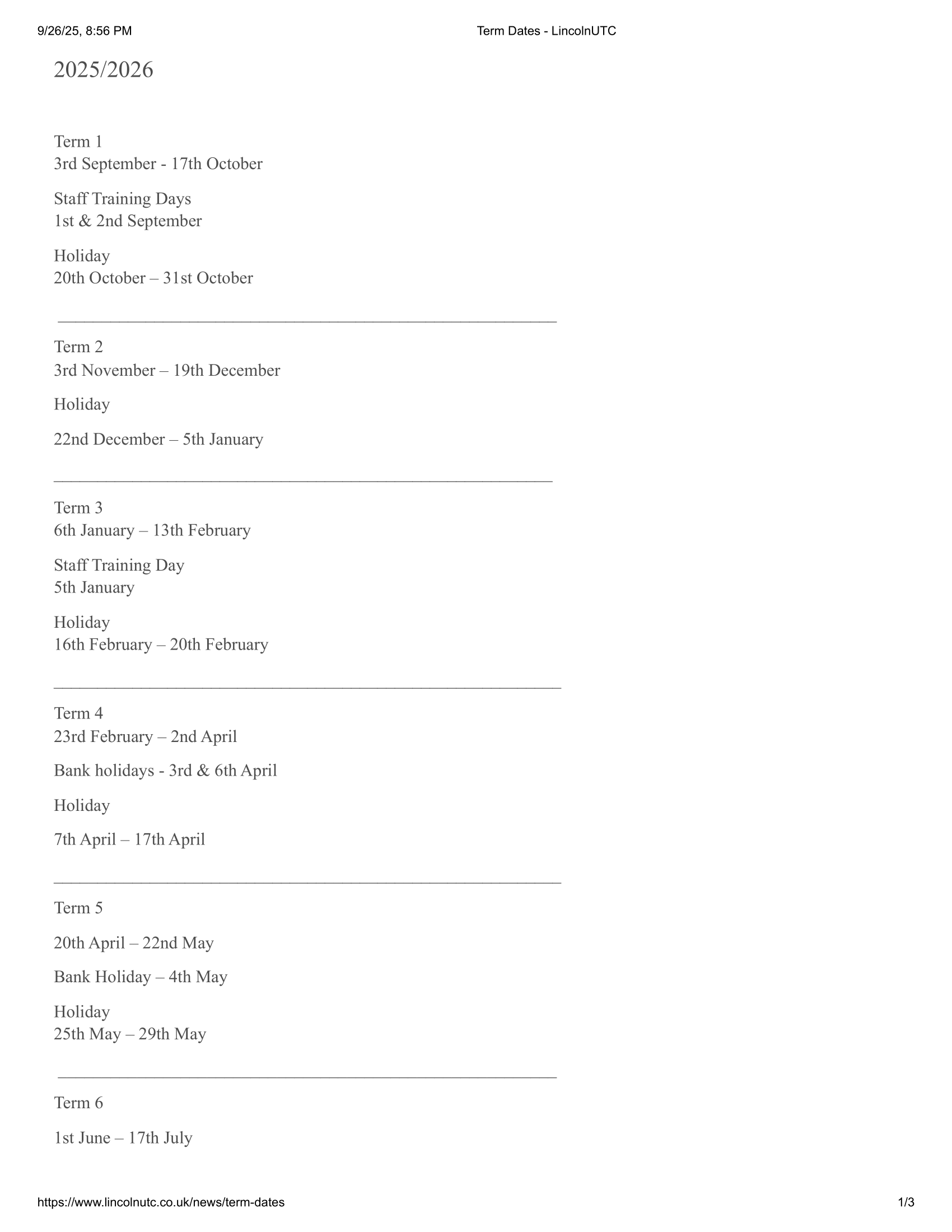 Lincoln UTC – Term Dates FAQs (2025–2026 & 2026–2027)