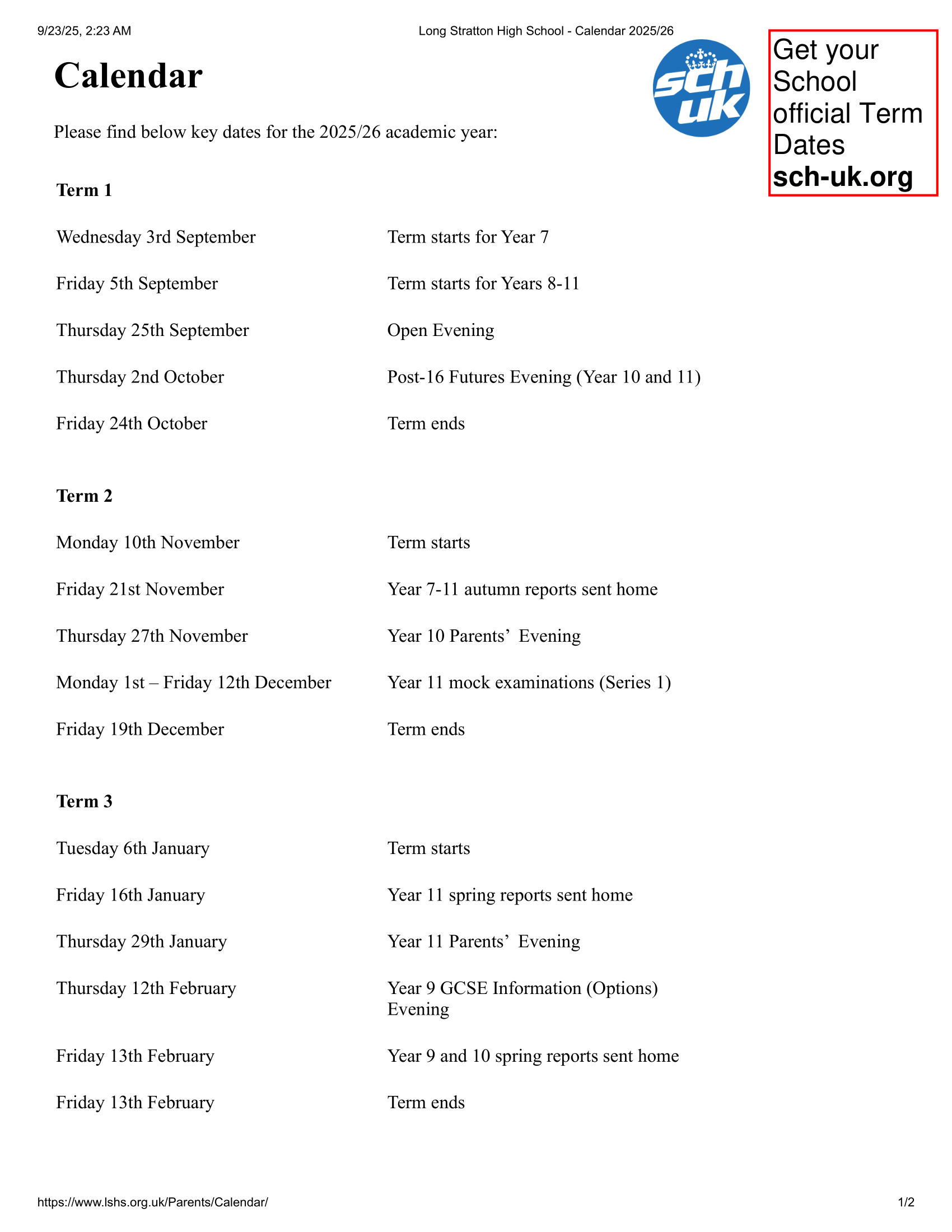 Long Stratton High School Term dates (2025-2026)