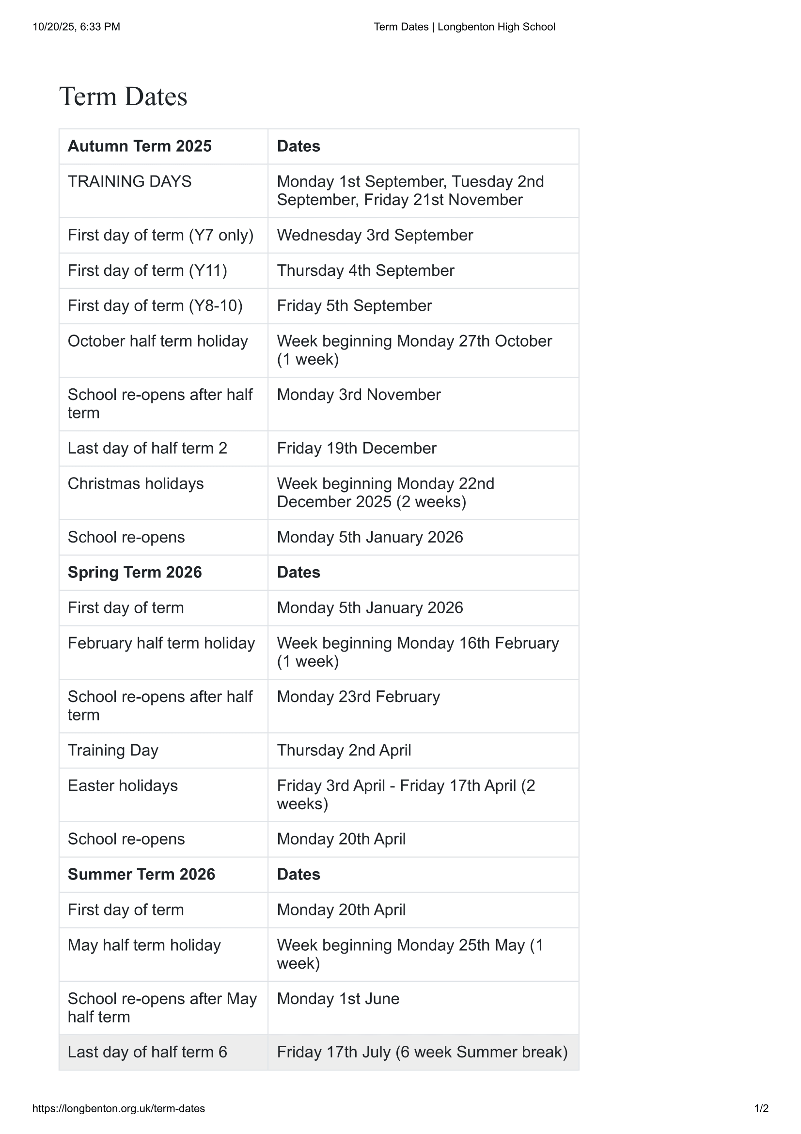 Longbenton High School – Term Dates FAQ (2025–2026)