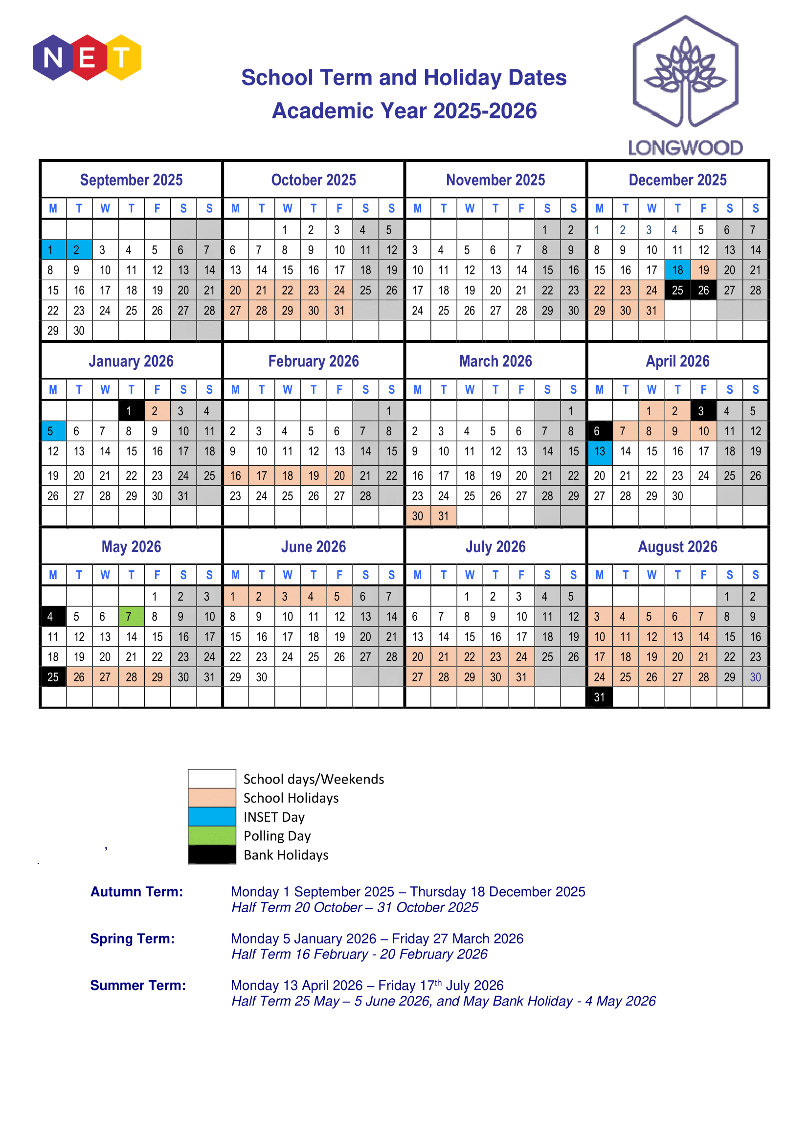 The school Term Dates shown on this page has been sourced directly from the official Longwood Primary Academy and Nursery term dates website. Please be aware that all dates and events may be amended at the discretion of the school or local council. For the most up-to-date and accurate information, we recommend checking the official council website or contacting the school office.