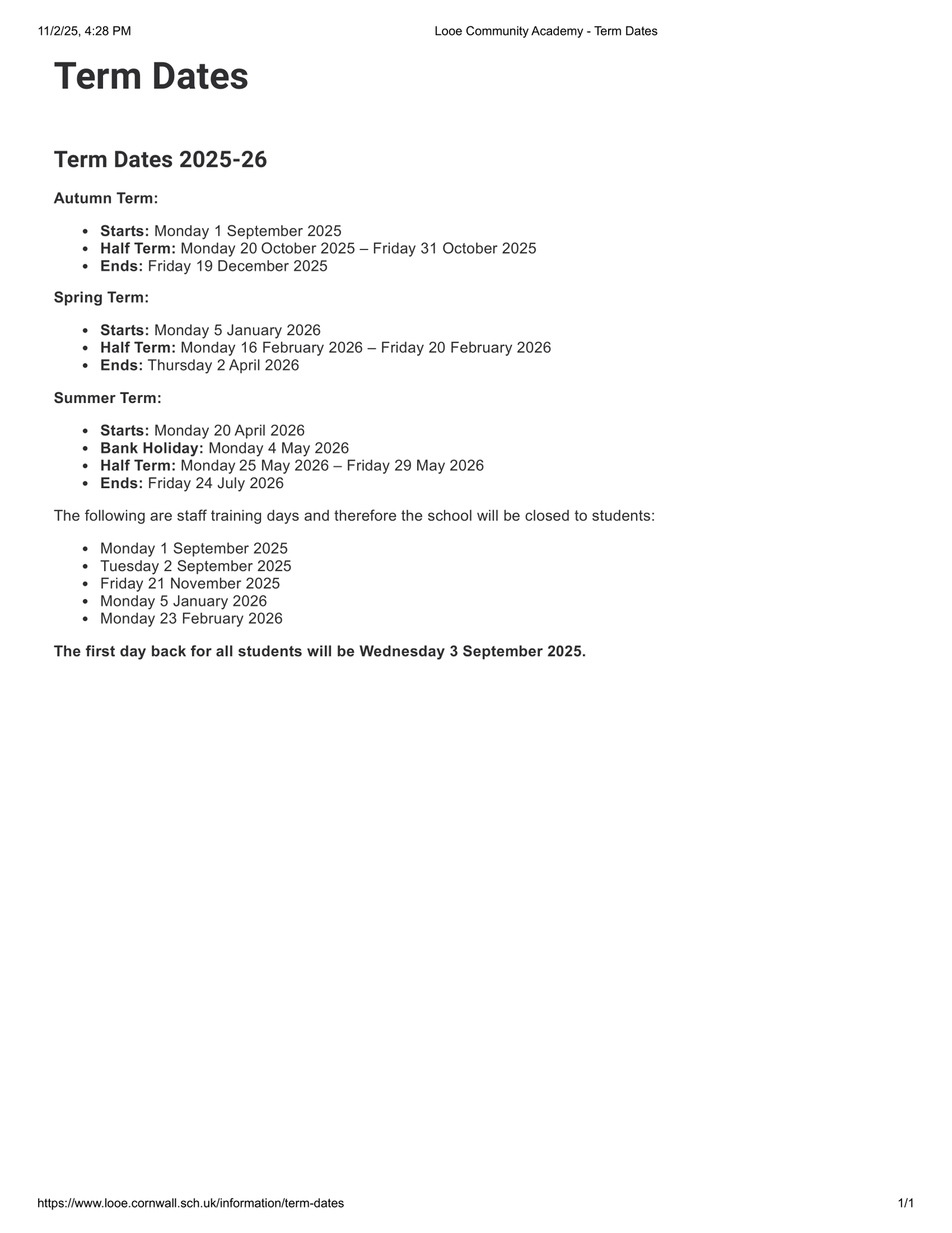 Looe Community Academy Term Dates 2025-26