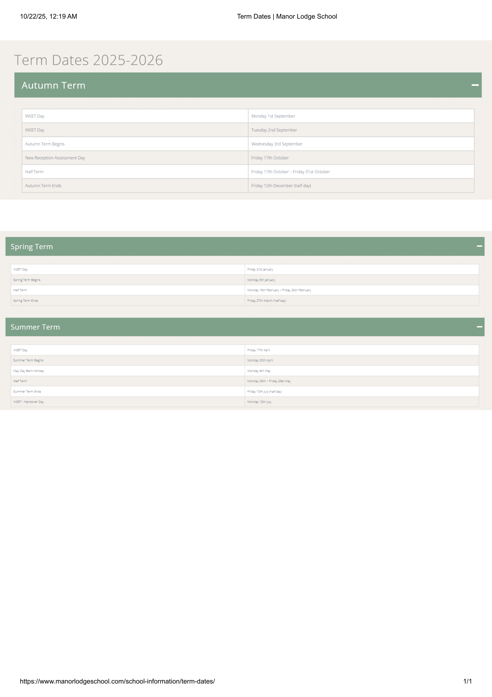 The school Term Dates shown on this page has been sourced directly from the official Manor Lodge School term dates website. Please be aware that all dates and events may be amended at the discretion of the school or local council. For the most up-to-date and accurate information, we recommend checking the official council website or contacting the school office.