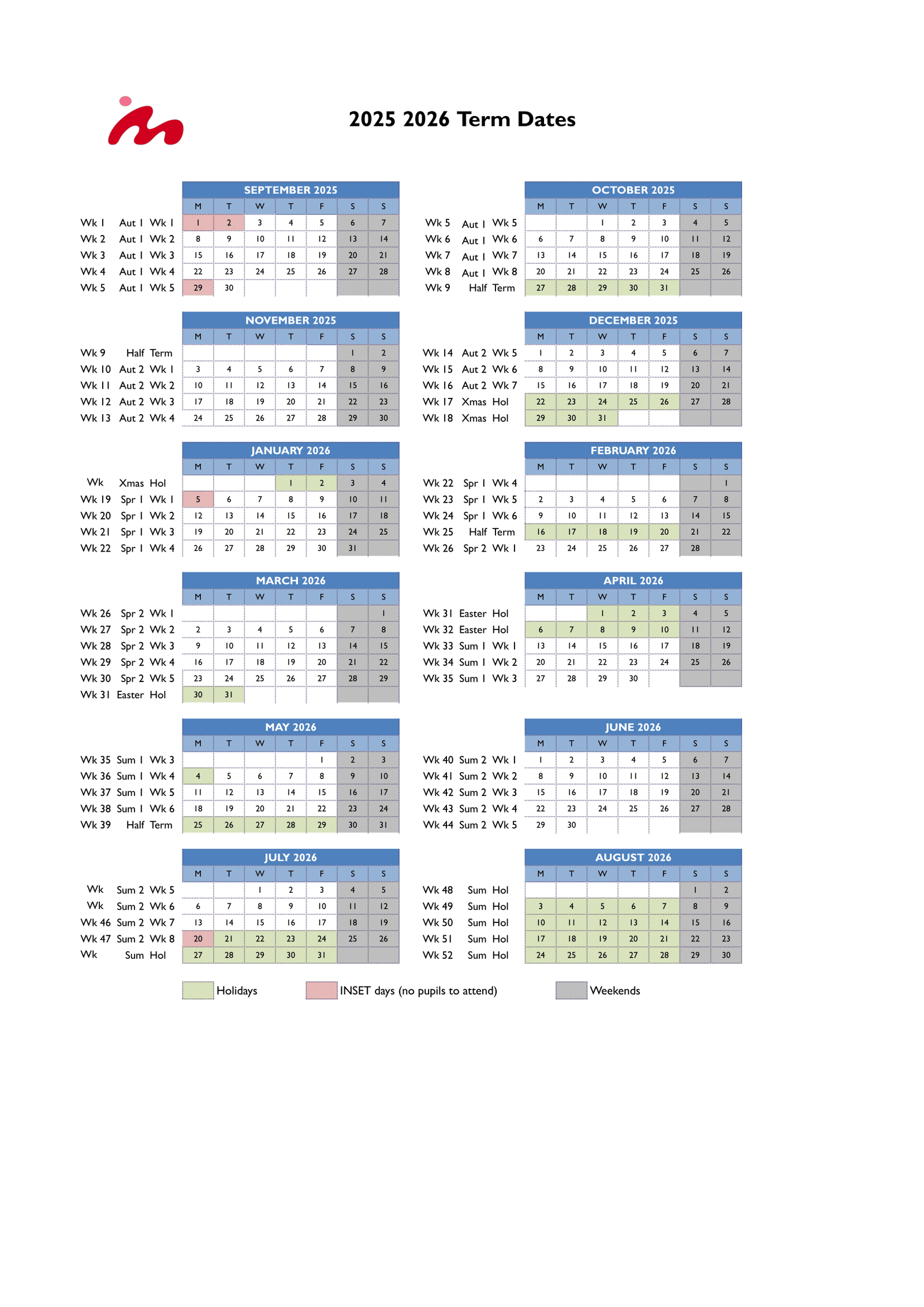 Please read: These dates are taken from the school’s published calendar for 2025–2026. Items reflect the legend categories (term dates, half terms, holidays, bank holidays, and inset days) exactly as shown on the calendar.