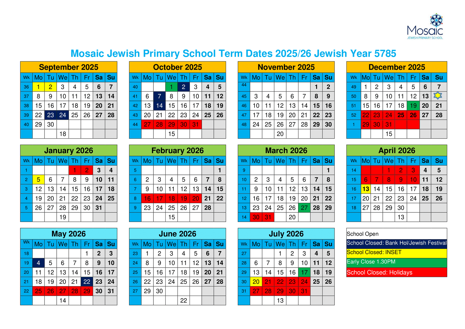 Mosaic Jewish Primary School Term Dates 2025–2026