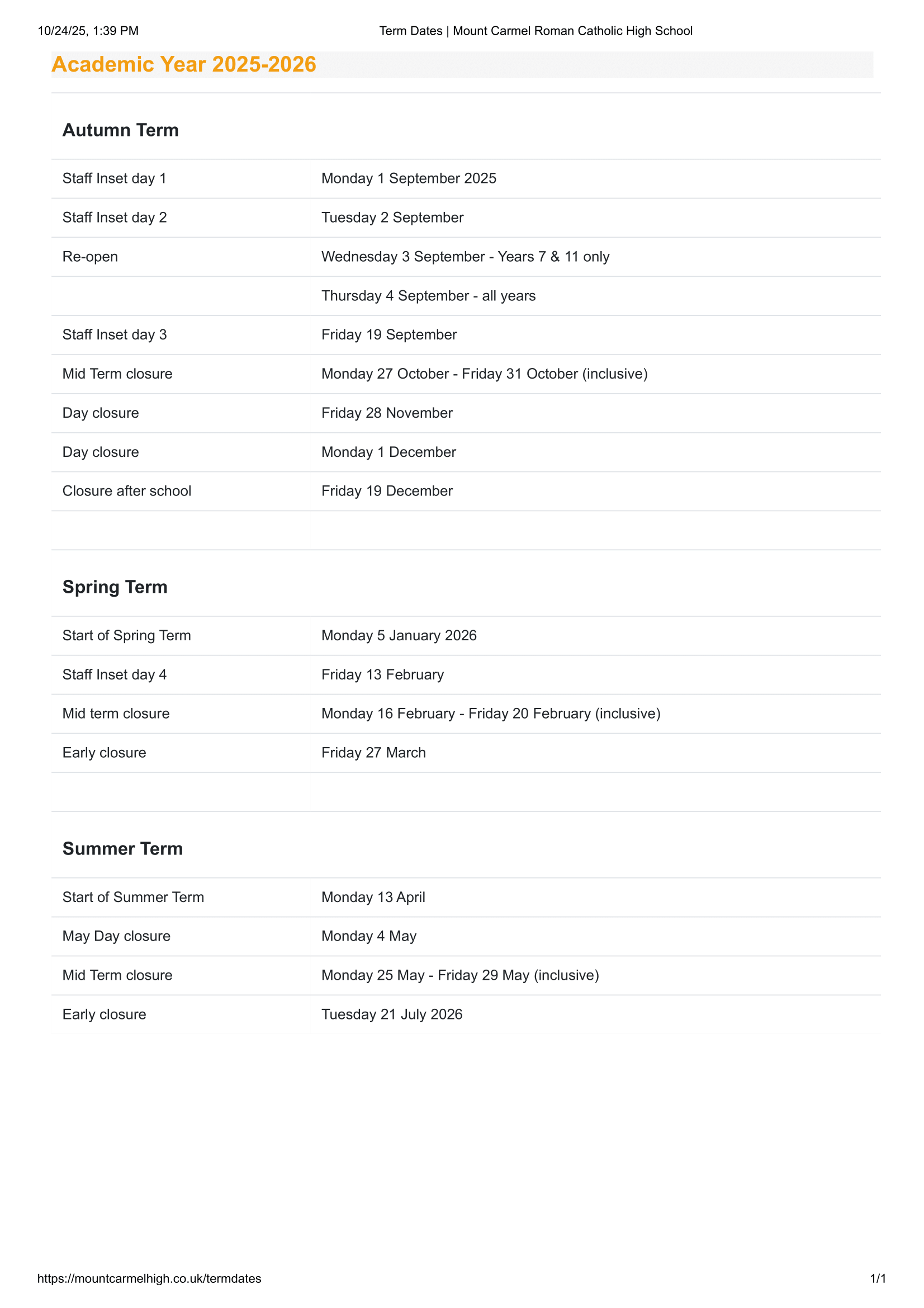 The school Term Dates shown on this page has been sourced directly from the official Mount Carmel Roman Catholic High School website. Please be aware that all dates and events may be amended at the discretion of the school or local council. For the most up-to-date and accurate information, we recommend checking the official council website or contacting the school office.