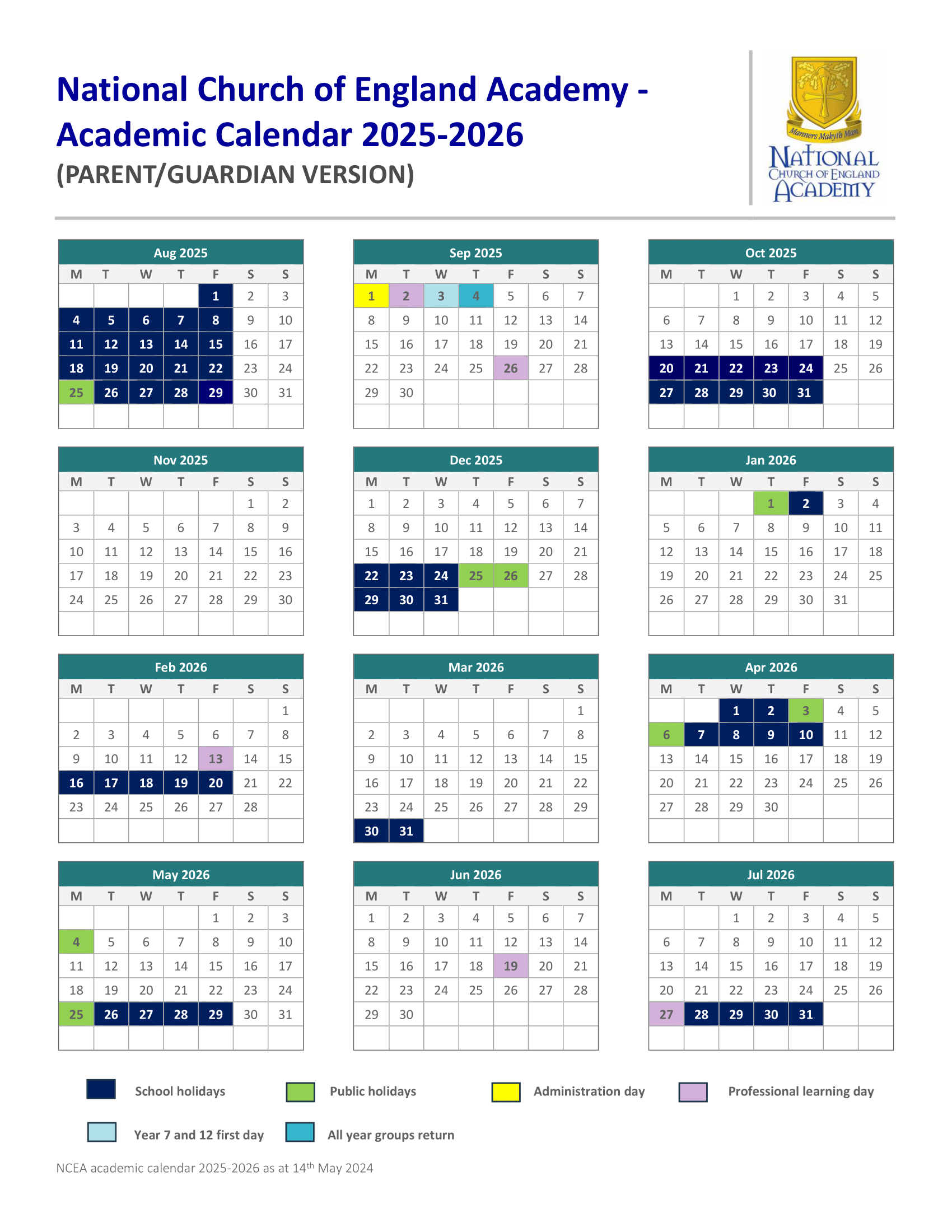National Church of England Academy Term dates (2025-2026)