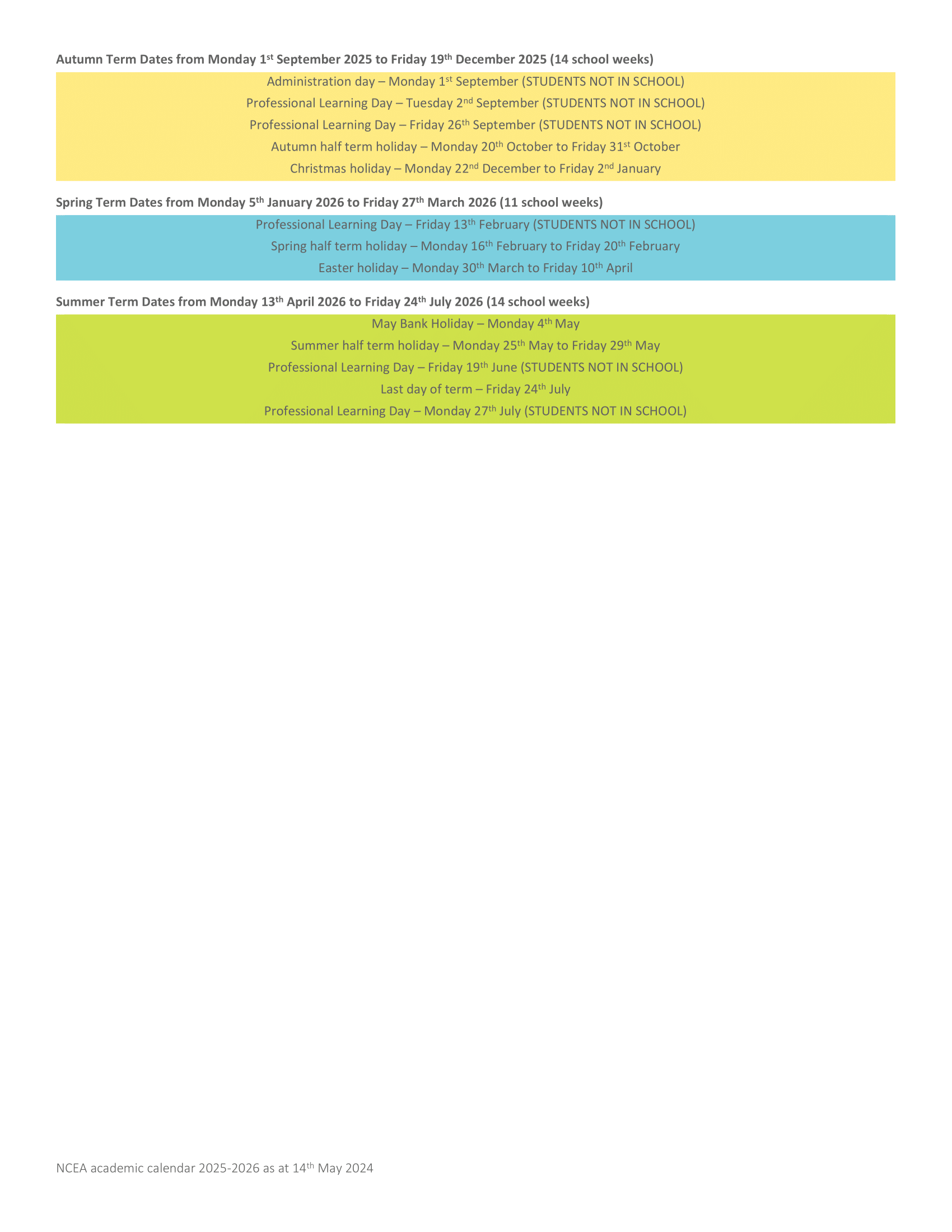 Summer Half Term: Monday 25 May 2026 – Friday 29 May 2026