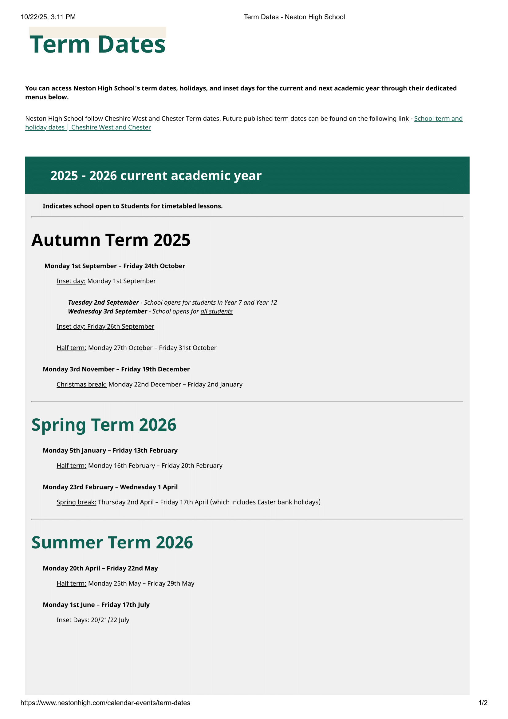 The school Term Dates shown on this page has been sourced directly from the official Neston High School Term Dates 25-26 Official website. Please be aware that all dates and events may be amended at the discretion of the school or local council. For the most up-to-date and accurate information, we recommend checking the official council website or contacting the school office.