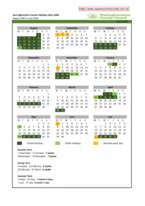 - Public holidays are marked in light green and may fall inside a school holiday period.