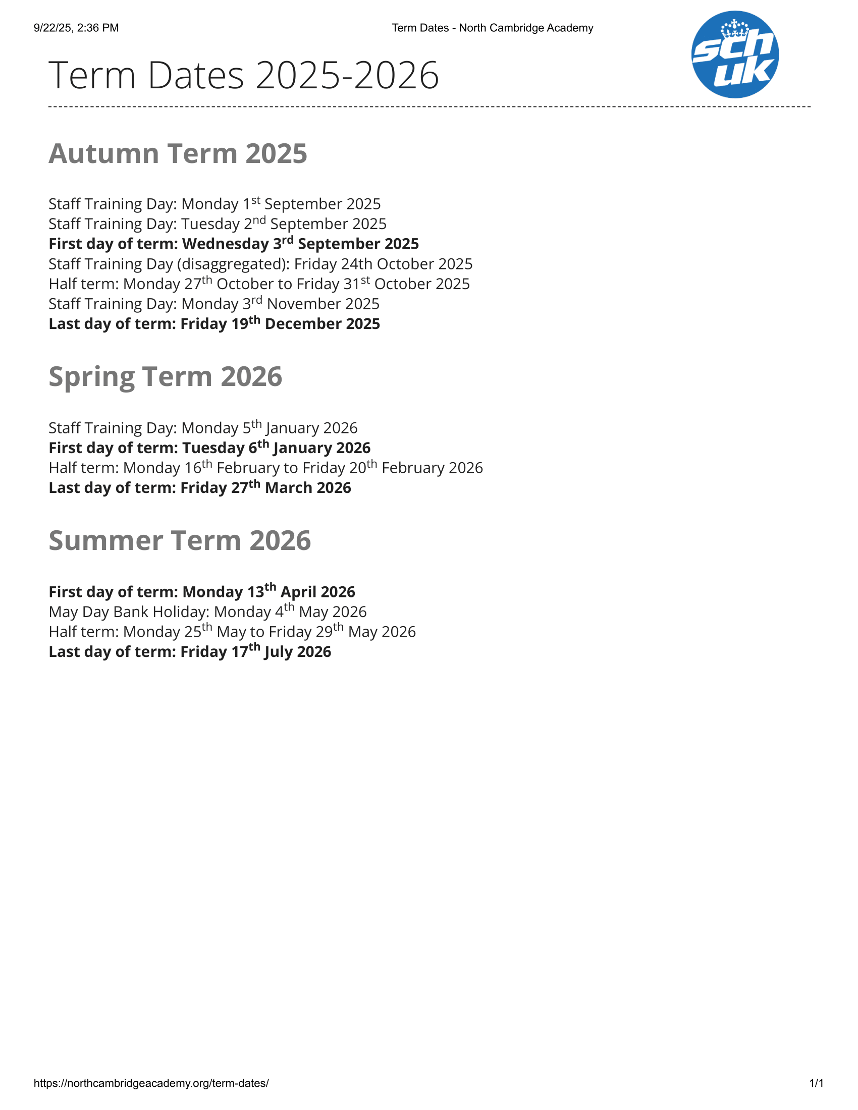 The school Term Dates shown on this page has been sourced directly from the official North Cambridge Academy term dates website. Please be aware that all dates and events may be amended at the discretion of the school or local council. For the most up-to-date and accurate information, we recommend checking the official council website or contacting the school office.