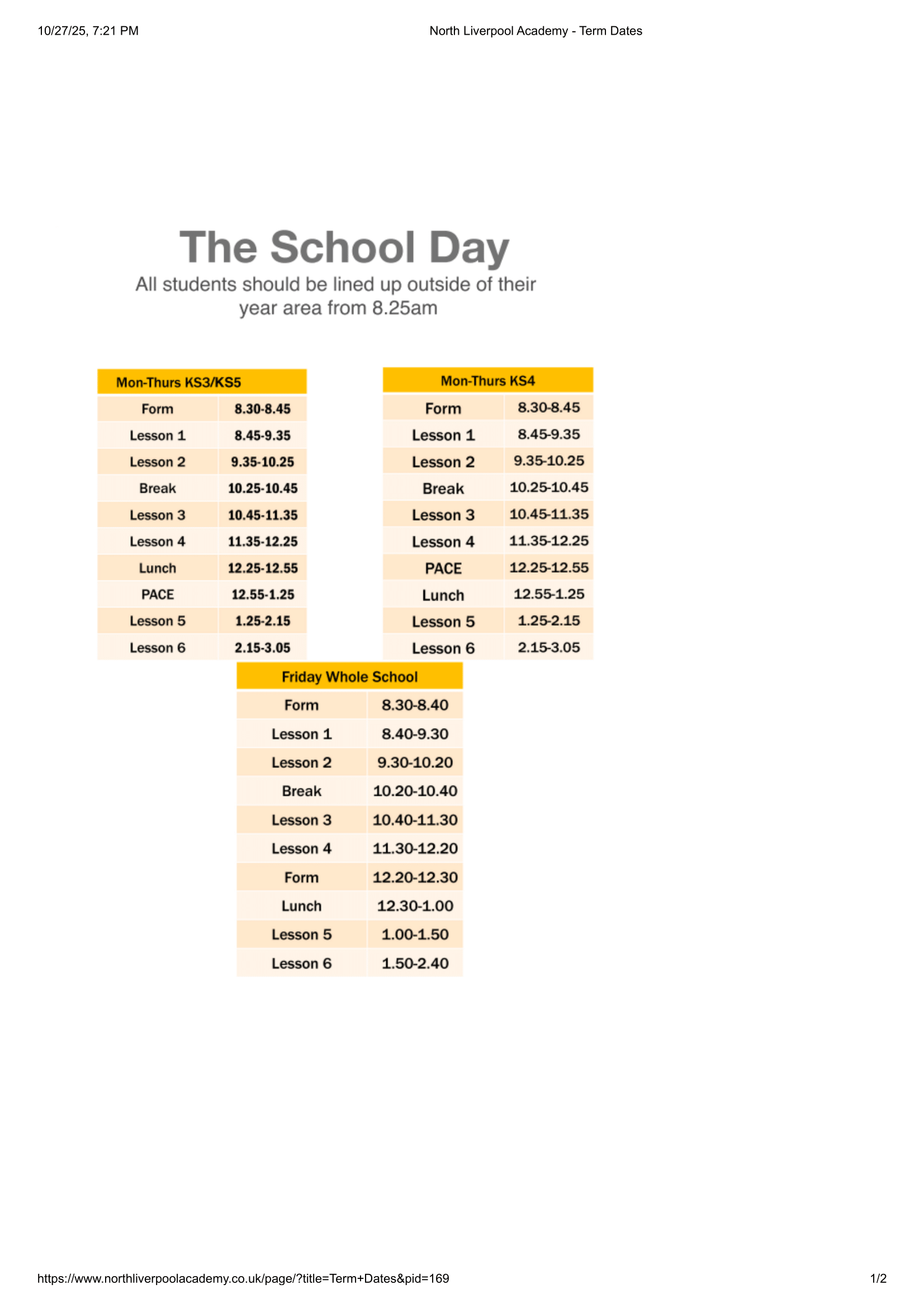The school Term Dates shown on this page has been sourced directly from the official North Liverpool Academy Term Dates website. Please be aware that all dates and events may be amended at the discretion of the school or local council. For the most up-to-date and accurate information, we recommend checking the official council website or contacting the school office.