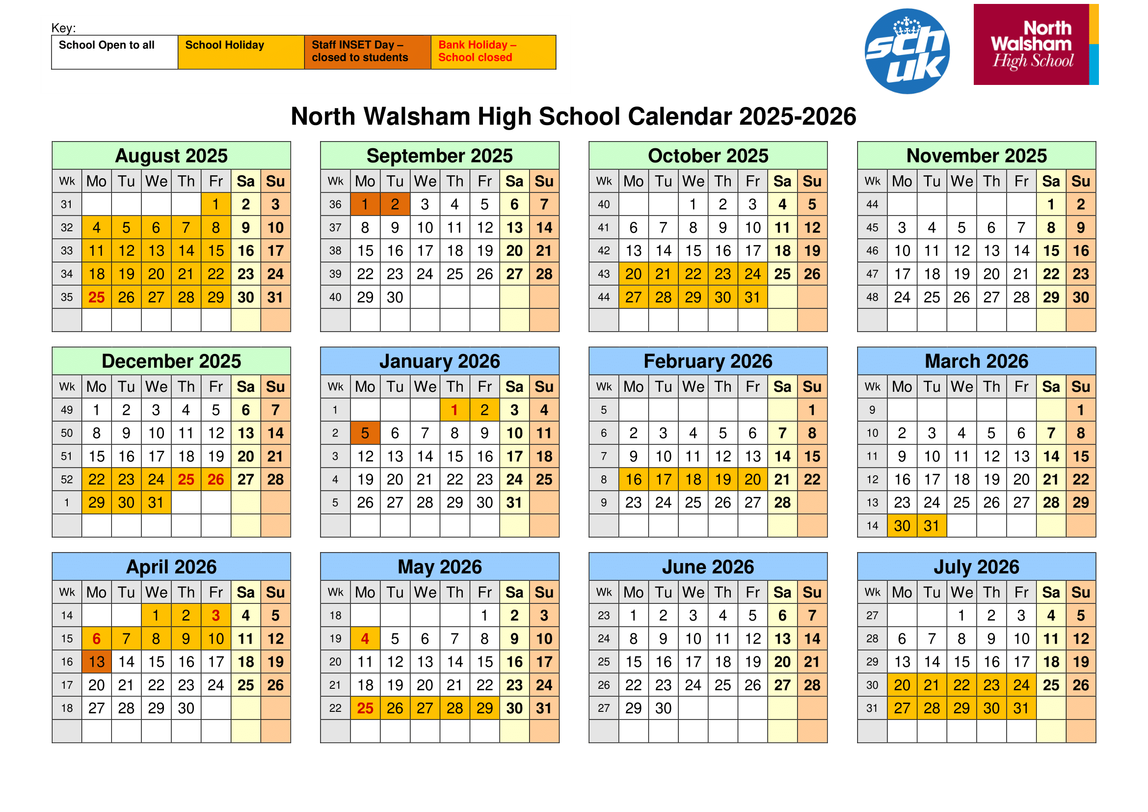The school Term Dates shown on this page has been sourced directly from the official North Walsham High School term dates website. Please be aware that all dates and events may be amended at the discretion of the school or local council. For the most up-to-date and accurate information, we recommend checking the official council website or contacting the school office.