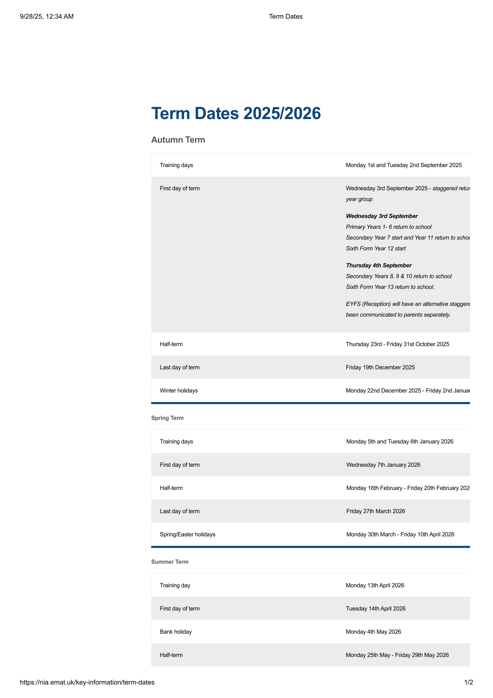 | Sep 3, 2025 | First Day of Term (Staggered return: Primary Years 1-6, Secondary Year 7 & 11, Sixth Form Year 12) |