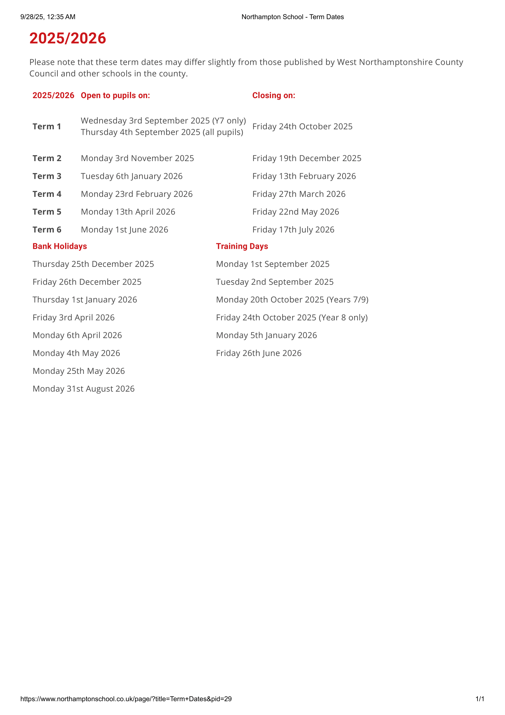 The school Term Dates shown on this page has been sourced directly from the official Northampton School term dates website. Please be aware that all dates and events may be amended at the discretion of the school or local council. For the most up-to-date and accurate information, we recommend checking the official council website or contacting the school office.