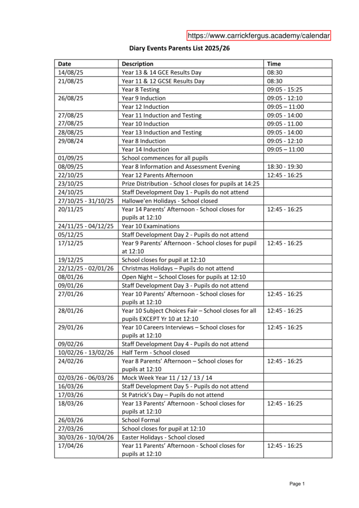 Carrickfergus Academy term dates 25-26 Revised