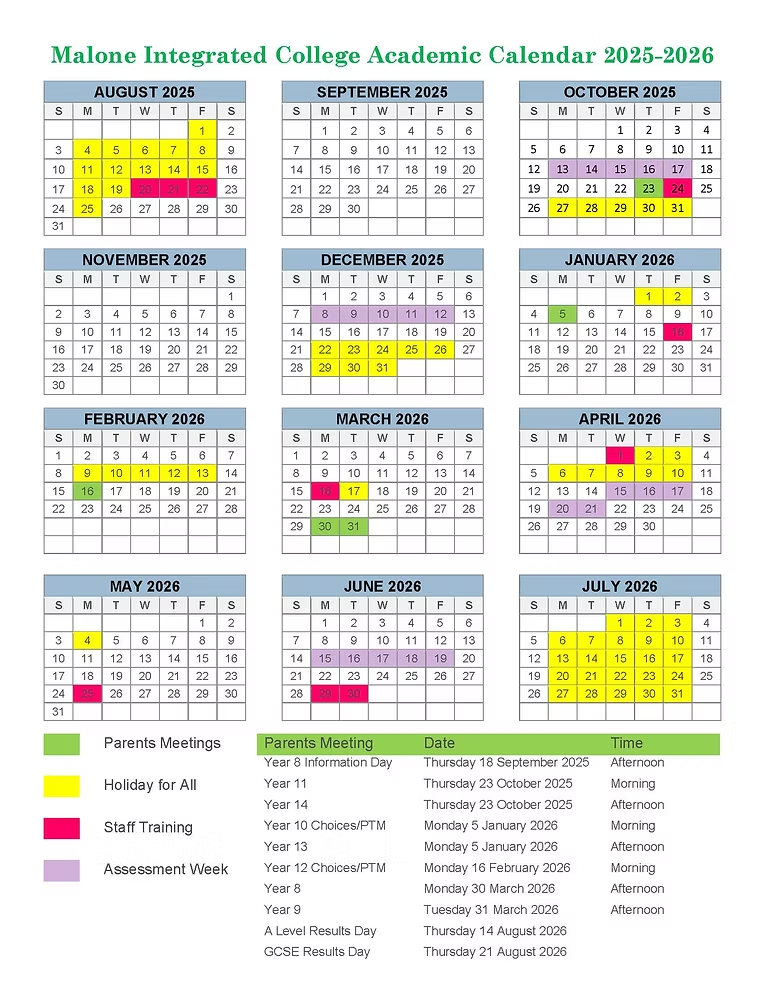Malone Integrated College term dates 25-26 Revised