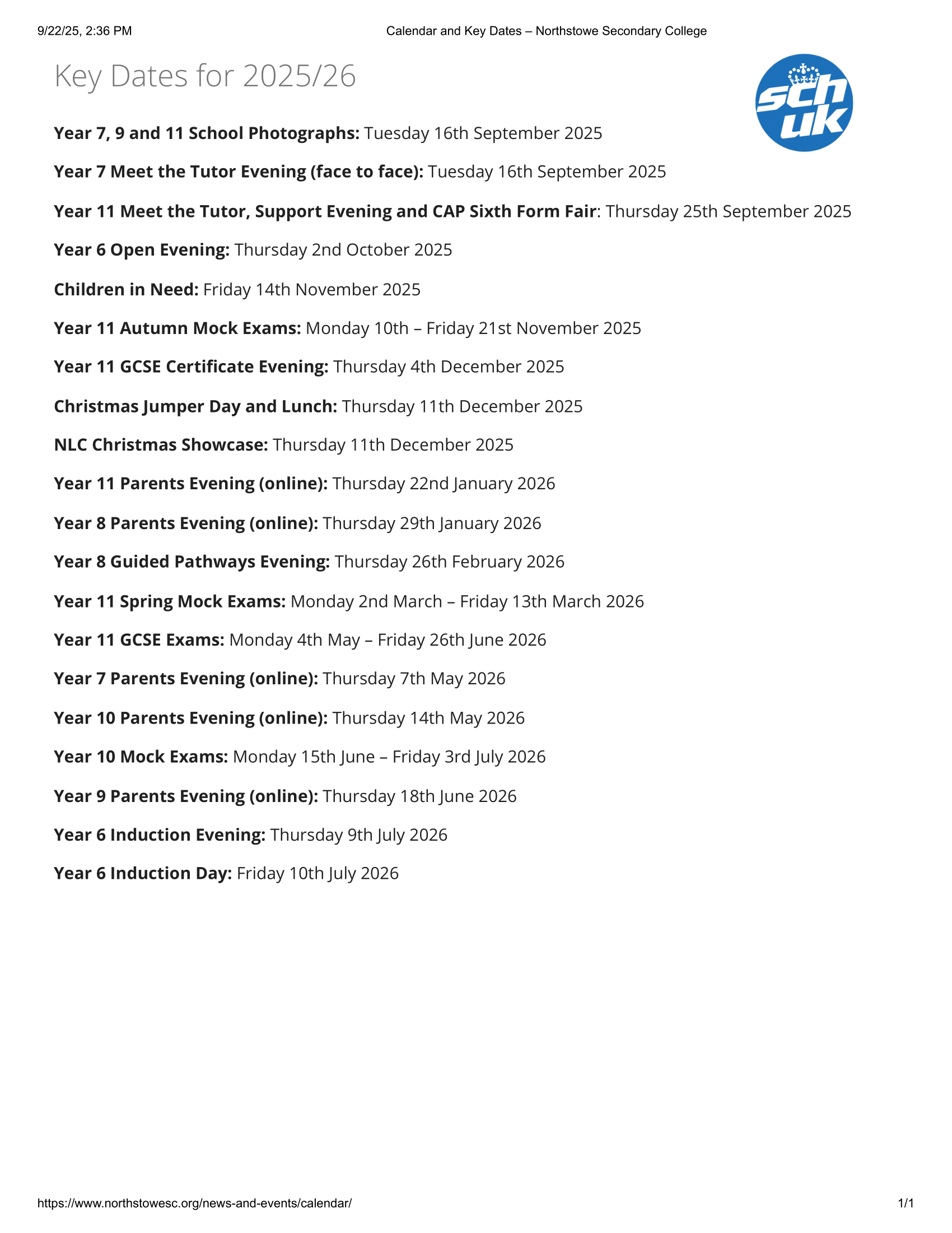 Source: “Calendar and Key Dates – Northstowe Secondary College” (2025/26). Items below reproduce only dates shown in the provided calendar image.