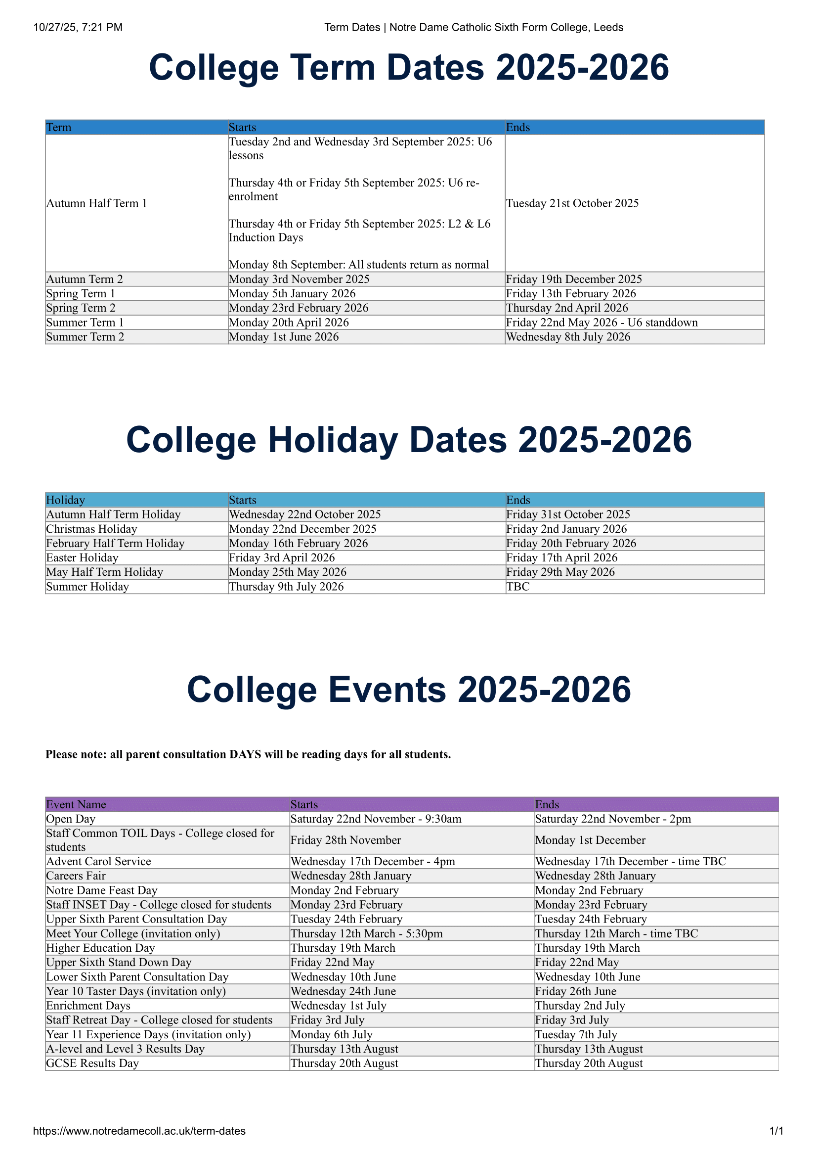 Notre Dame Catholic Sixth Form College, Leeds – Term Dates FAQ (2025–2026)