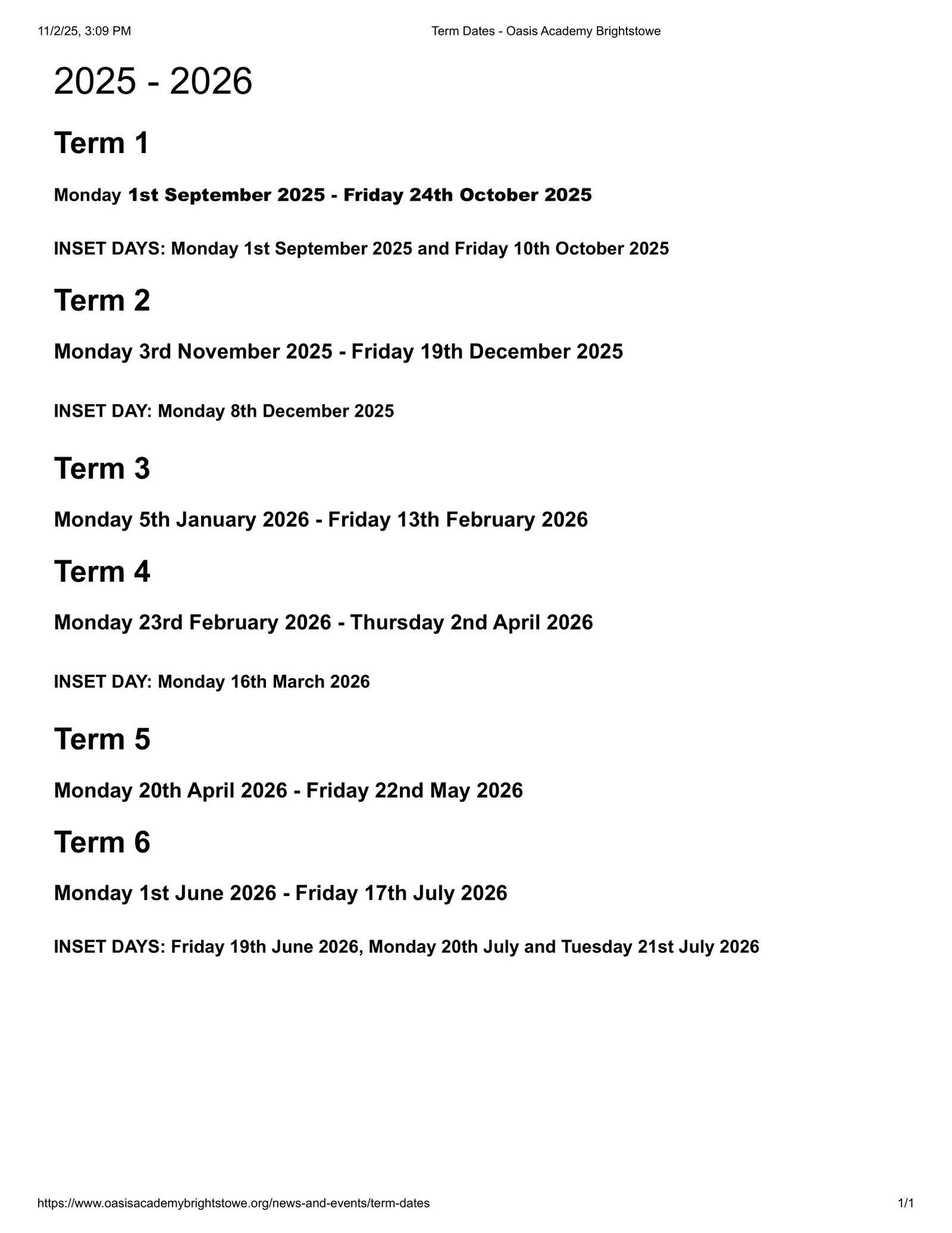 Oasis Academy Brightstowe Term dates (2025-2026)