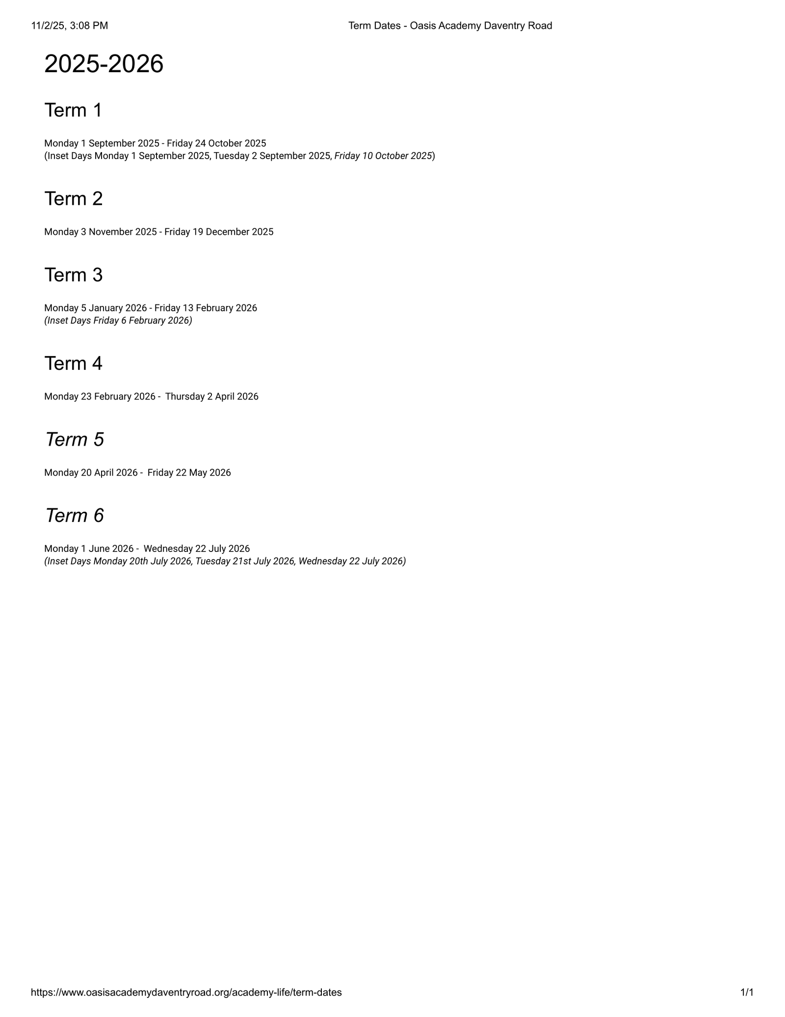 Oasis Academy Daventry Road Term Dates 2025–2026