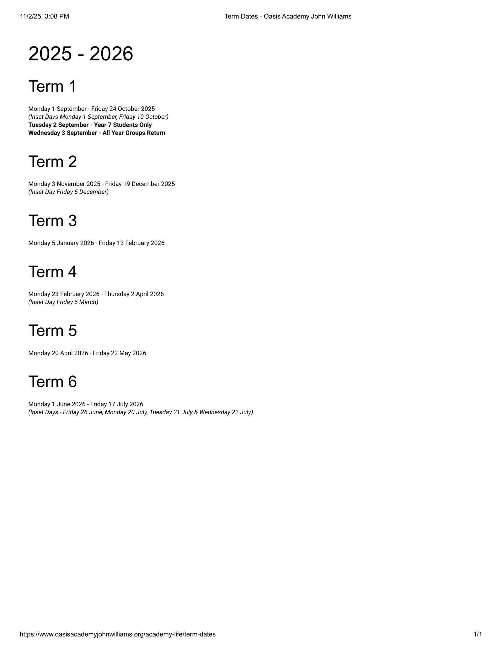 The school Term Dates shown on this page has been sourced directly from the official Oasis Academy John Williams Term Dates 25-26 [REVISED] website. Please be aware that all dates and events may be amended at the discretion of the school or local council. For the most up-to-date and accurate information, we recommend checking the official council website or contacting the school office.