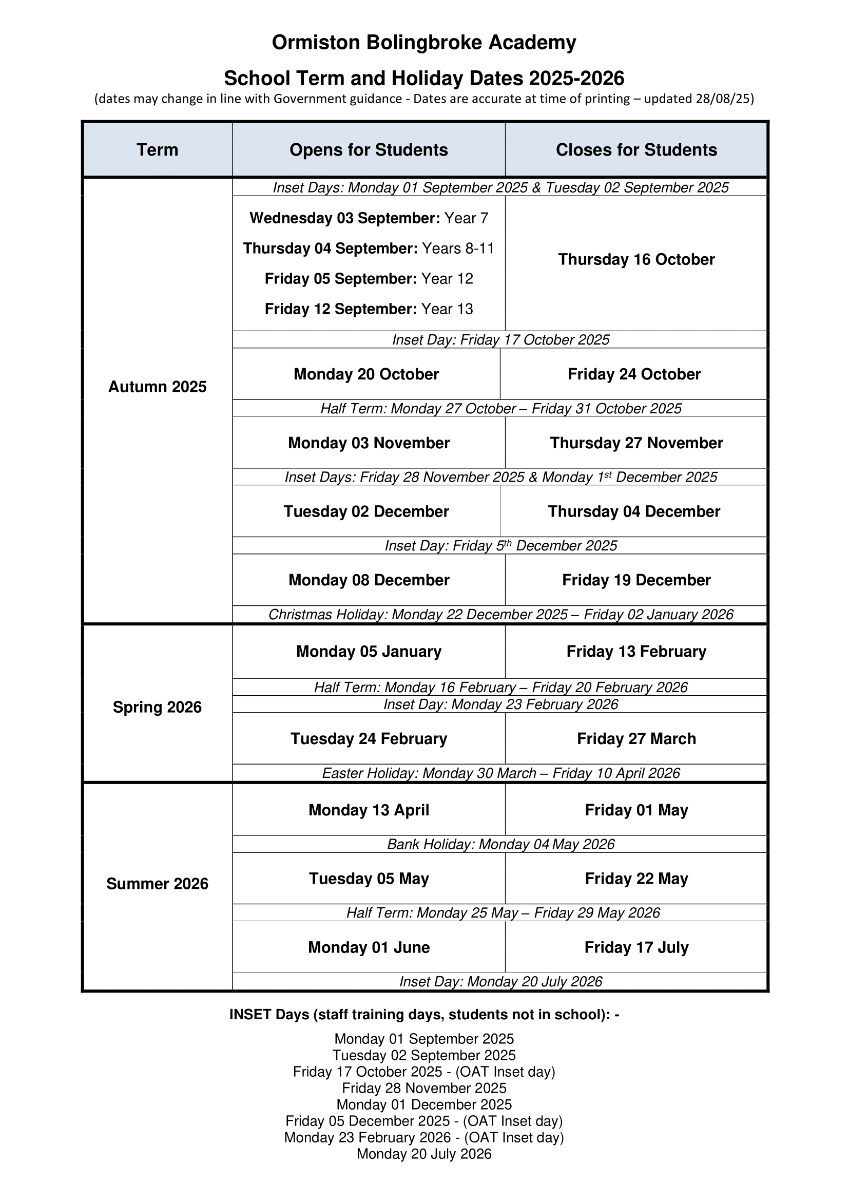 The school Term Dates shown on this page has been sourced directly from the official Ormiston Bolingbroke Academy website. Please be aware that all dates and events may be amended at the discretion of the school or local council. For the most up-to-date and accurate information, we recommend checking the official council website or contacting the school office.