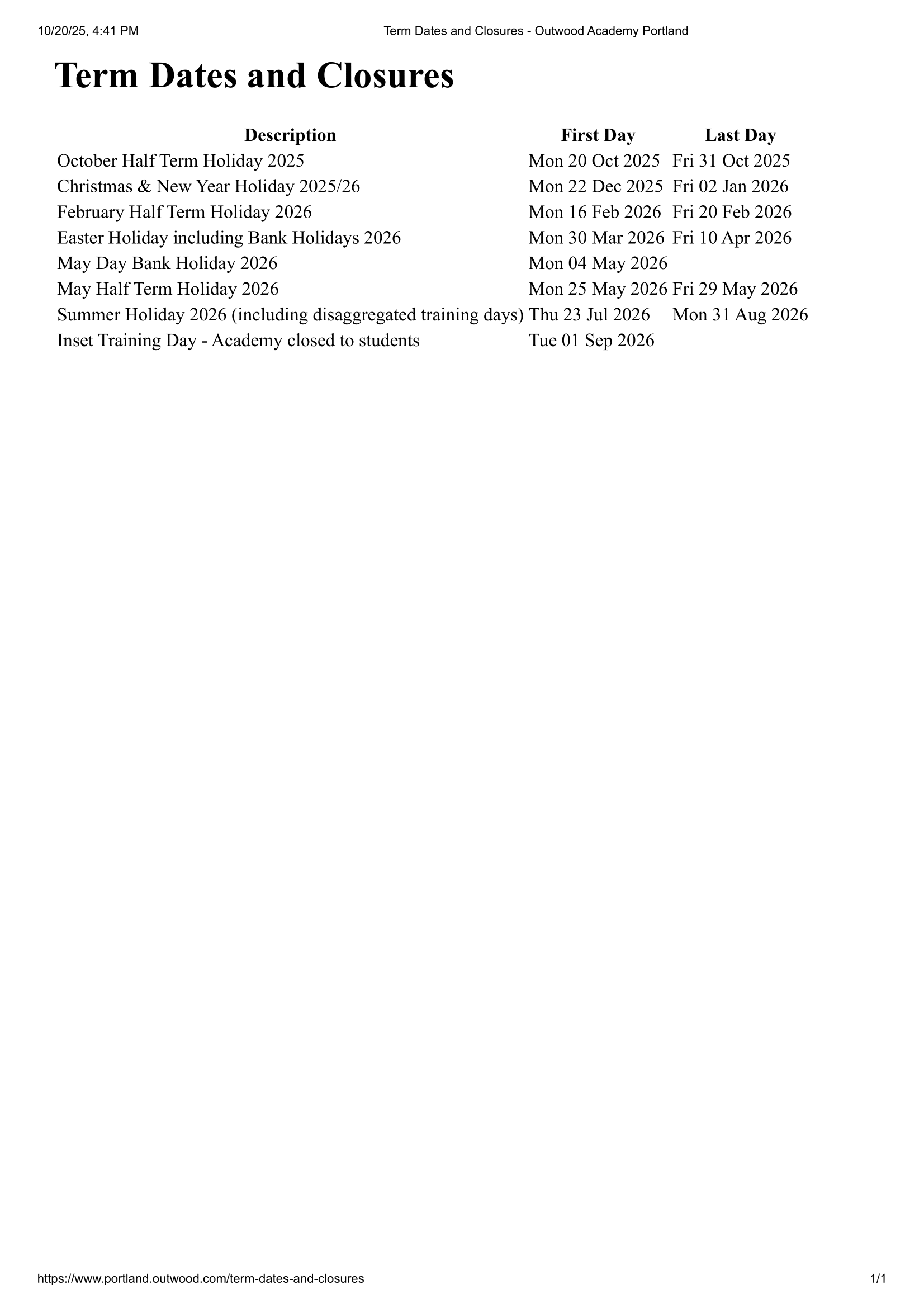 The school Term Dates shown on this page has been sourced directly from the official Outwood Academy Portland Term Dates 25-26 Official Update website. Please be aware that all dates and events may be amended at the discretion of the school or local council. For the most up-to-date and accurate information, we recommend checking the official council website or contacting the school office.