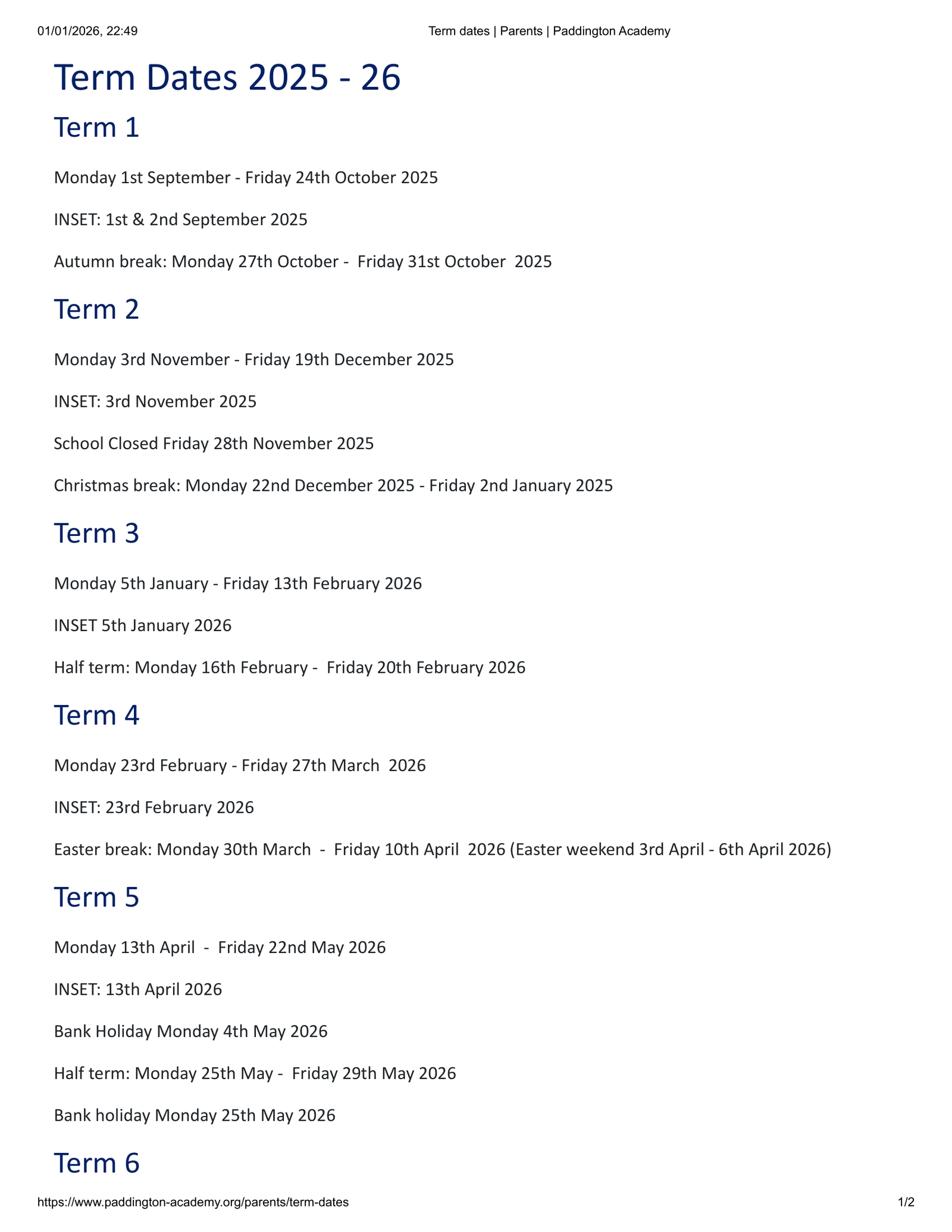 The school Term Dates shown on this page has been sourced directly from the official Paddington Academy Term Dates 25-26 Revised [PDF] website. Please be aware that all dates and events may be amended at the discretion of the school or local council. For the most up-to-date and accurate information, we recommend checking the official council website or contacting the school office.