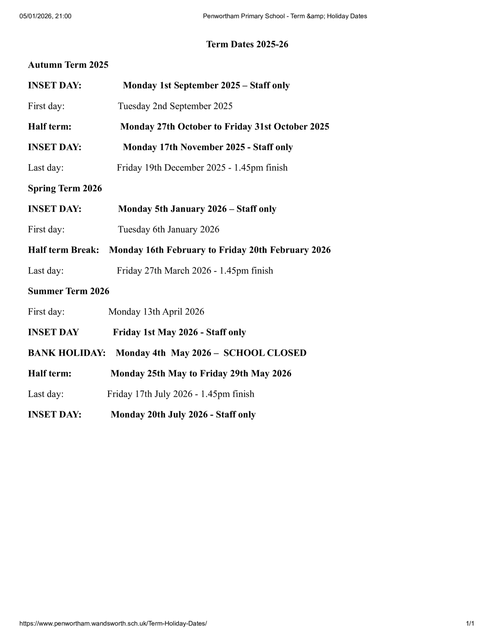 INSET days are scheduled on Monday 1st September 2025, Monday 17th November 2025, Monday 5th January 2026, Friday 1st May 2026, and Monday 20th July 2026. These are staff-only days.