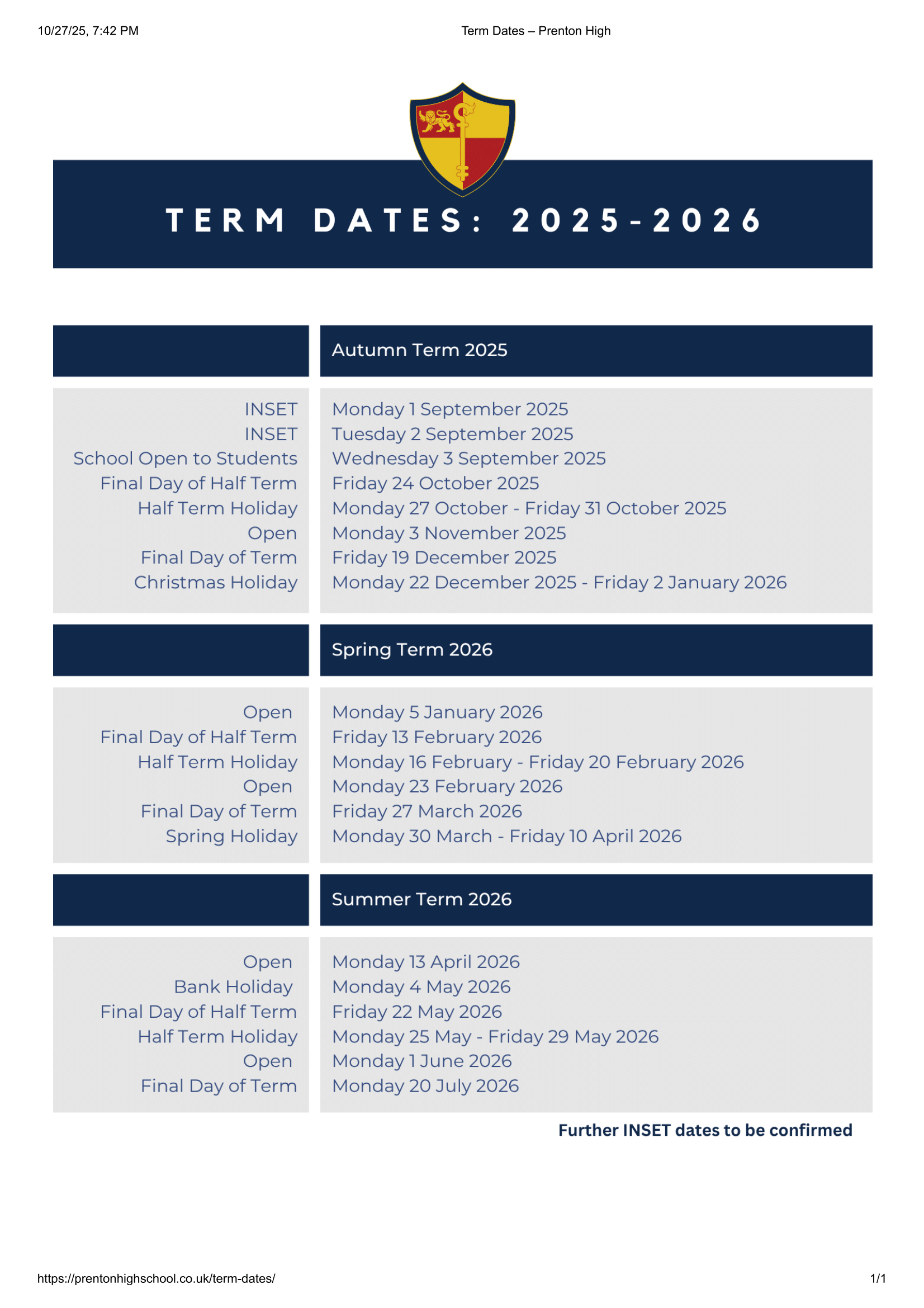 The school Term Dates shown on this page has been sourced directly from the official Prenton High School Term Dates 25-26 Official Updates website. Please be aware that all dates and events may be amended at the discretion of the school or local council. For the most up-to-date and accurate information, we recommend checking the official council website or contacting the school office.