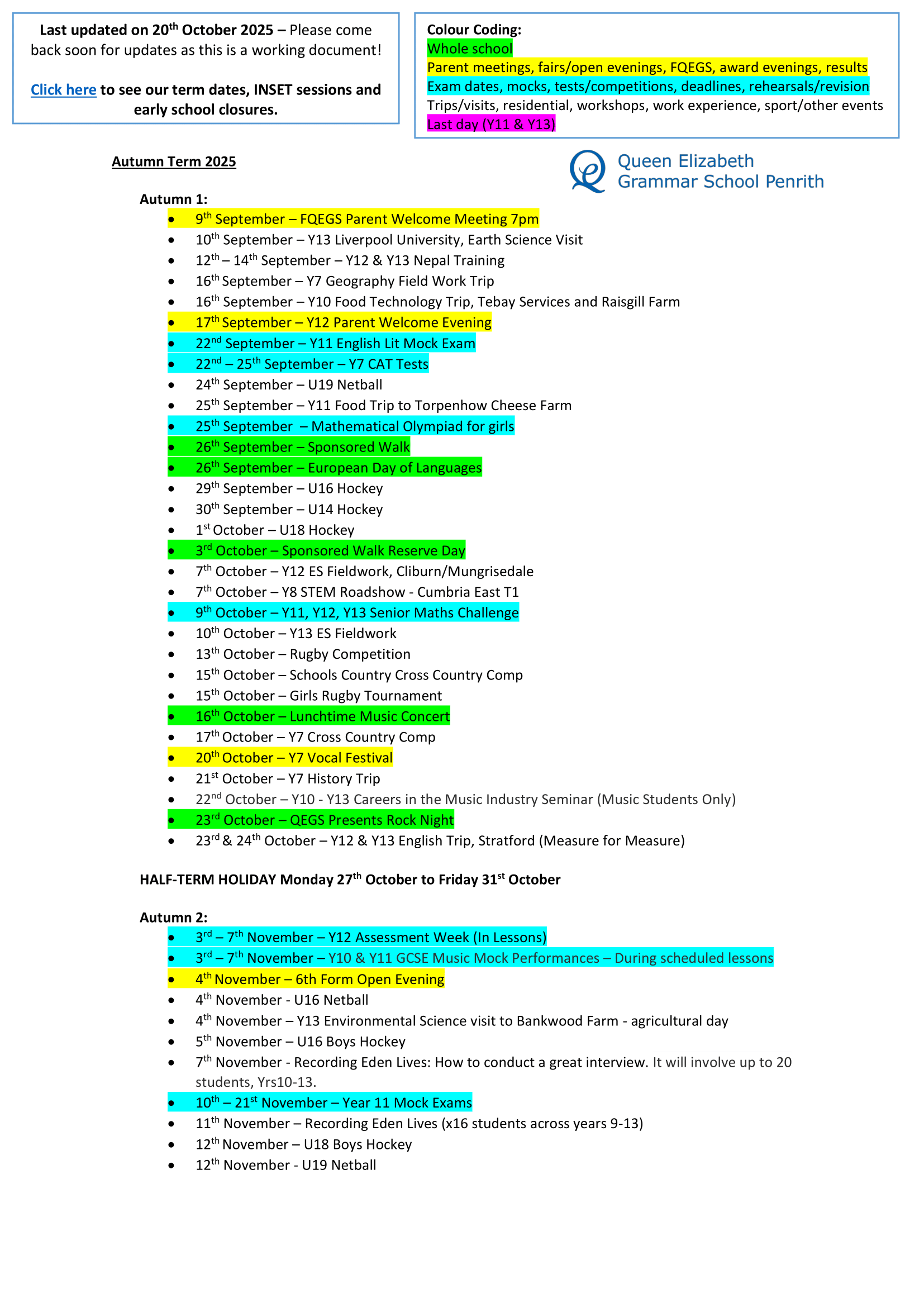 Queen Elizabeth Grammar School Penrith — Term Dates & Key FAQs (2025–2026)