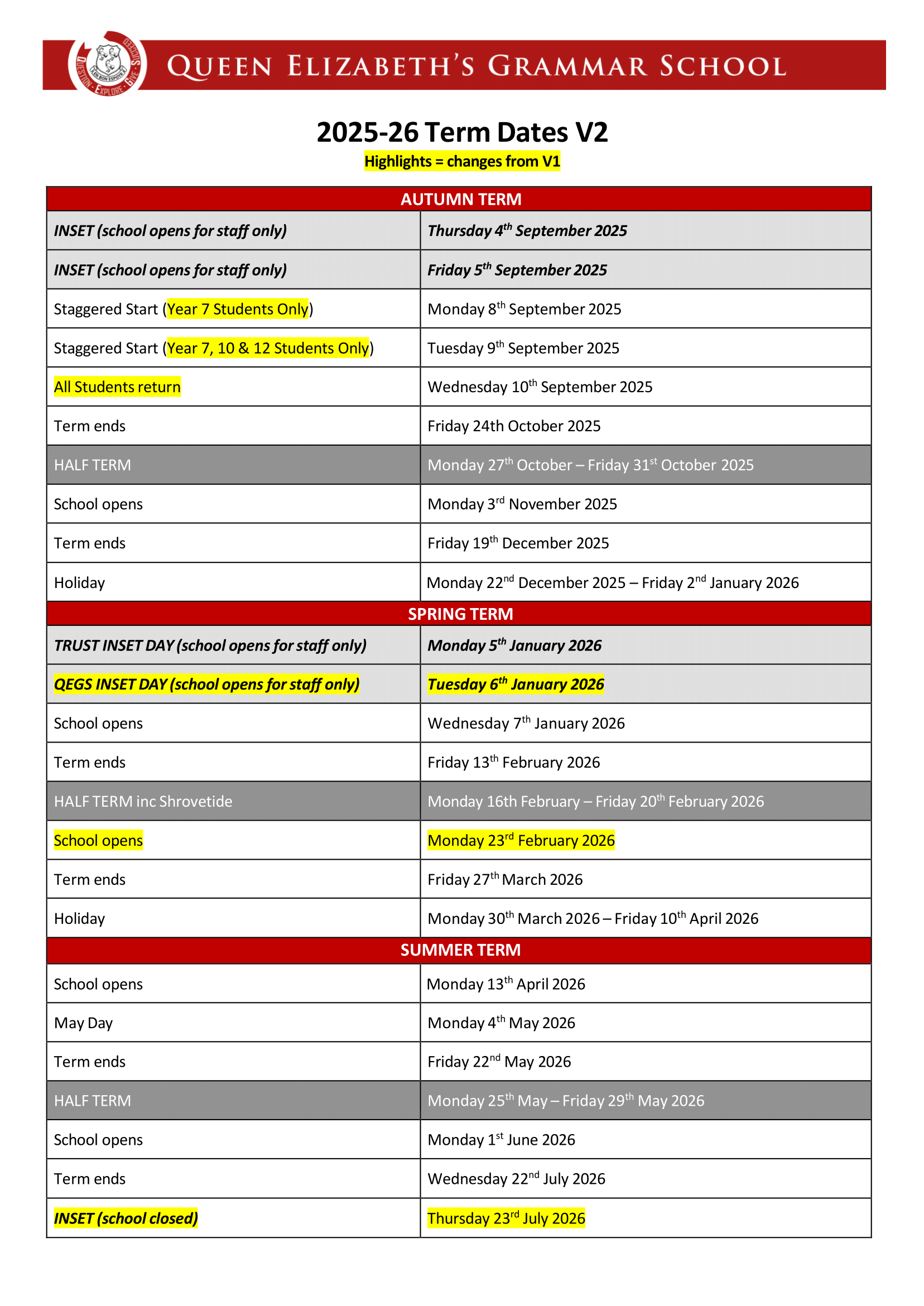 Queen Elizabeth's Grammar School Term dates (2025-2026)