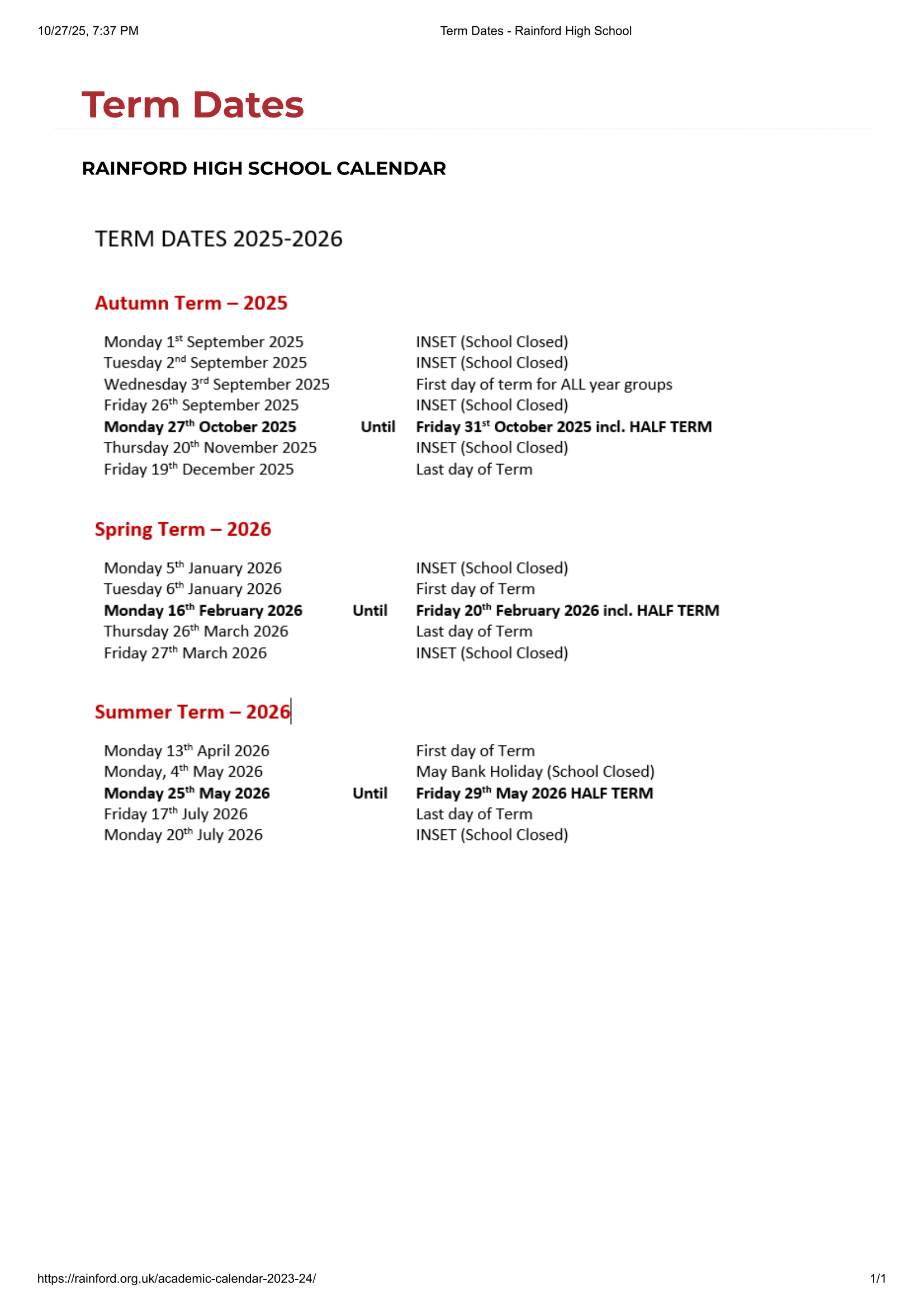 The school Term Dates shown on this page has been sourced directly from the official Rainford High, St Helens Term Dates 25-26 Official Updates website. Please be aware that all dates and events may be amended at the discretion of the school or local council. For the most up-to-date and accurate information, we recommend checking the official council website or contacting the school office.