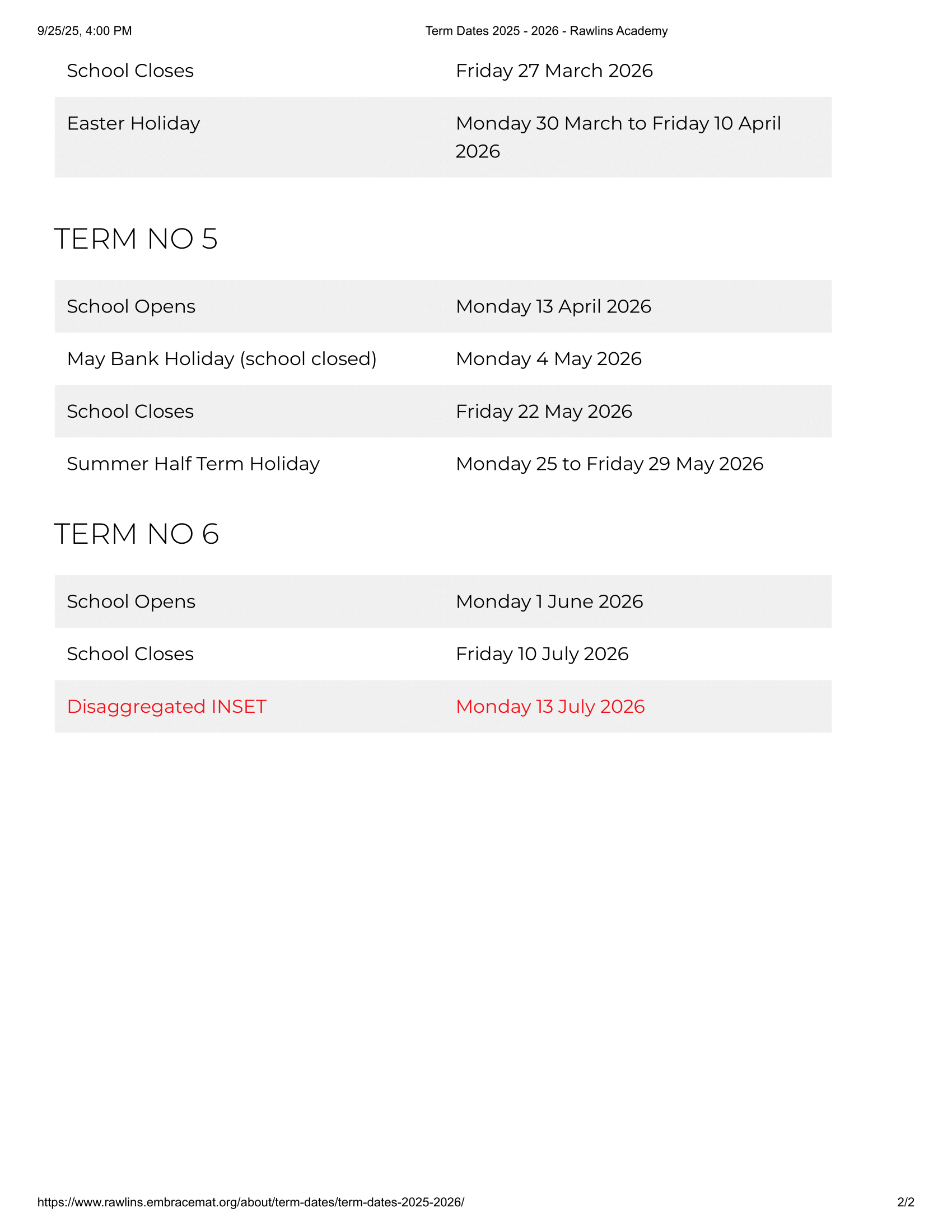 Rawlins Academy – Term Dates 2025–2026: https://www.rawlins.embracemat.org/about/term-dates/term-dates-2025-2026/