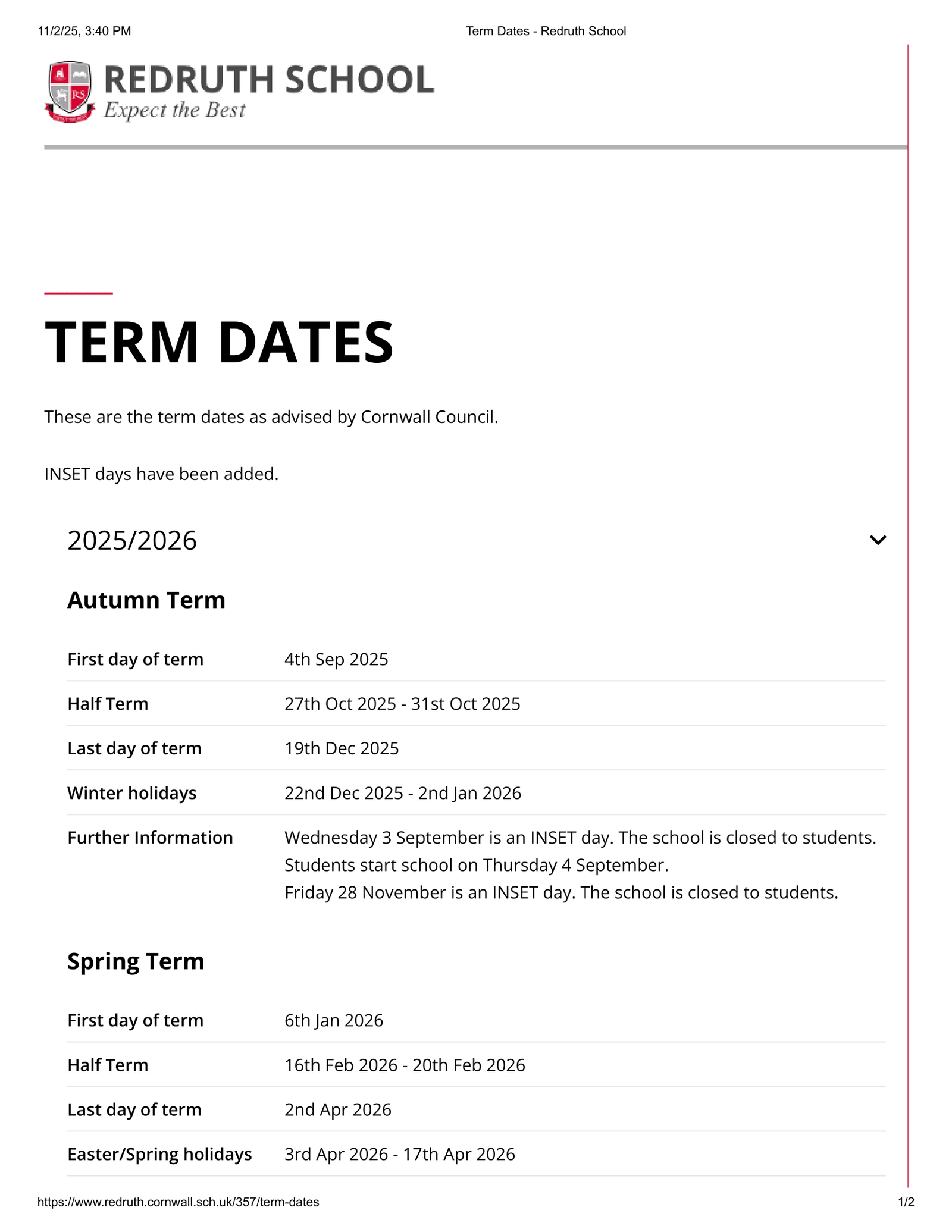 Redruth School — Term Dates FAQ (2025/2026)
