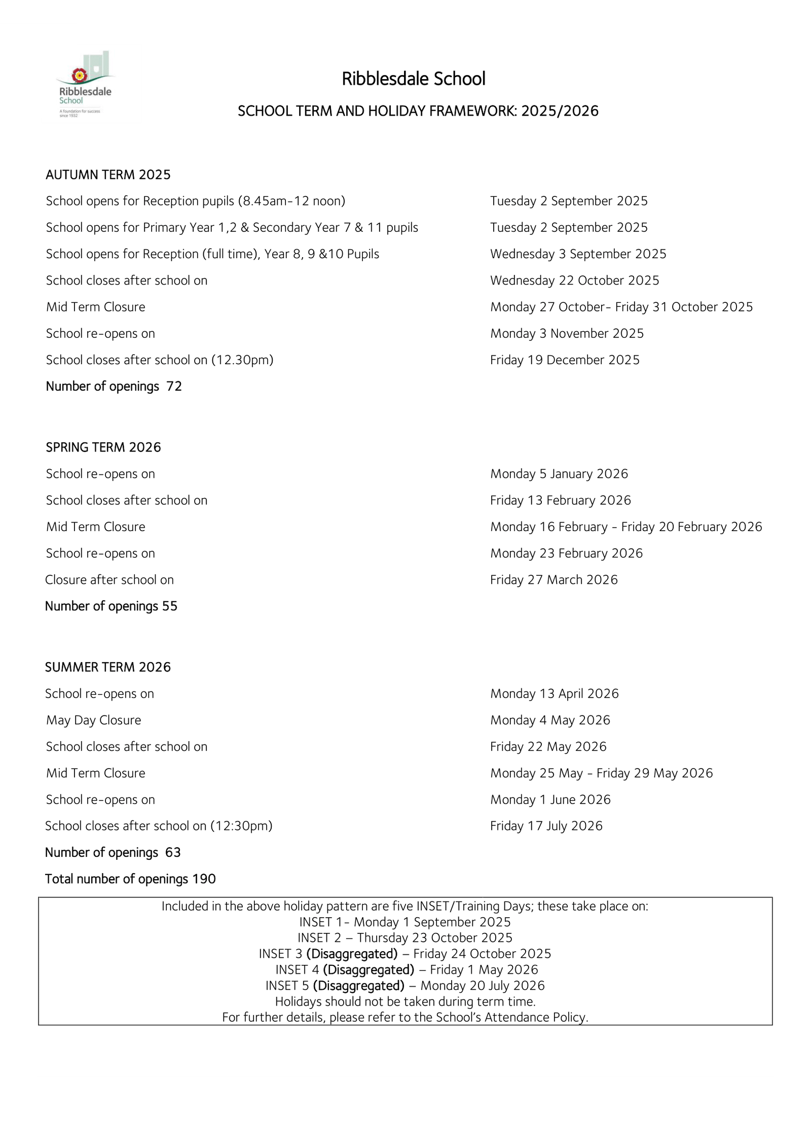 There are a total of 190 school openings across the academic year at Ribblesdale School.