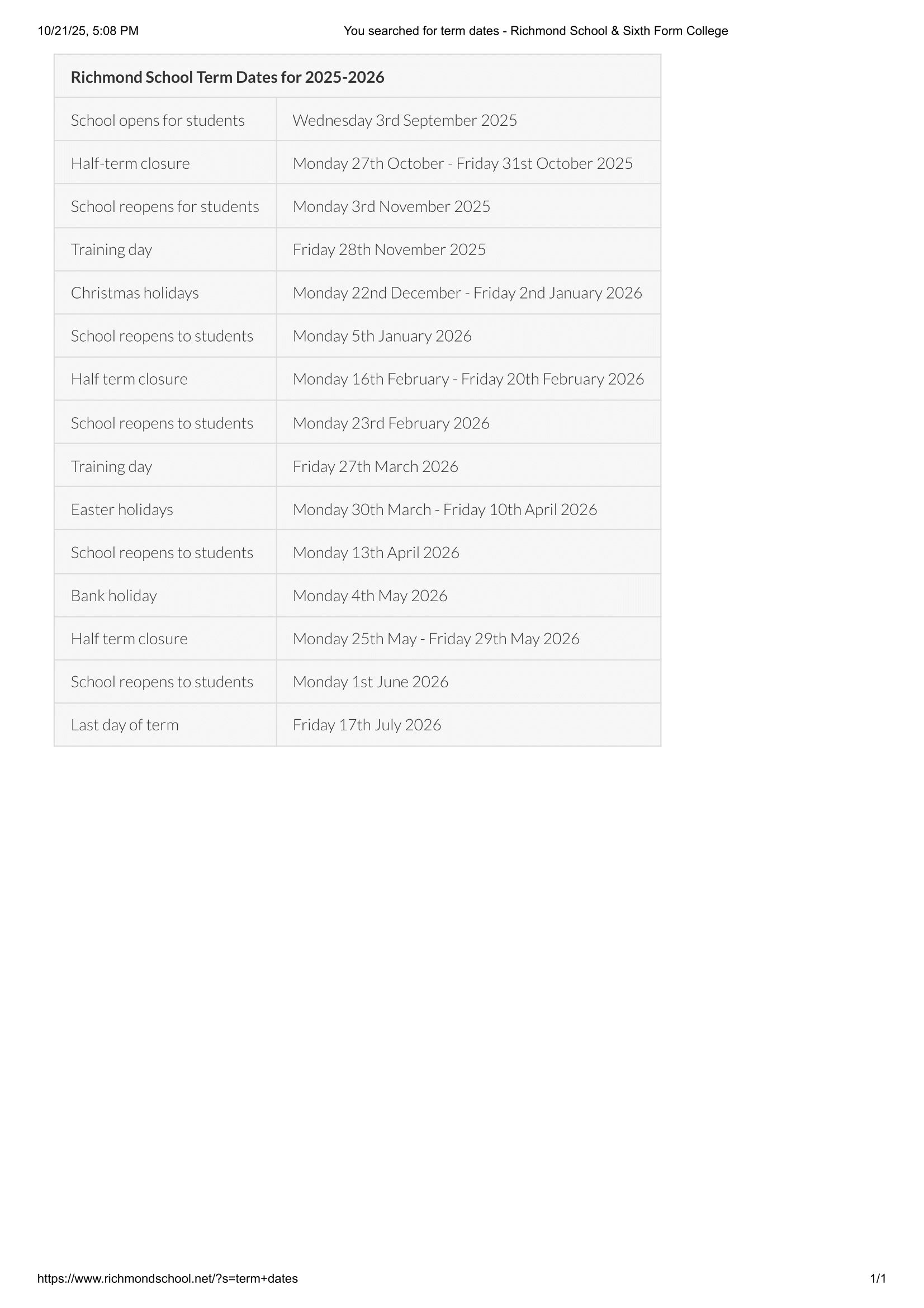 Richmond School & Sixth Form College Term dates (2025-2026)