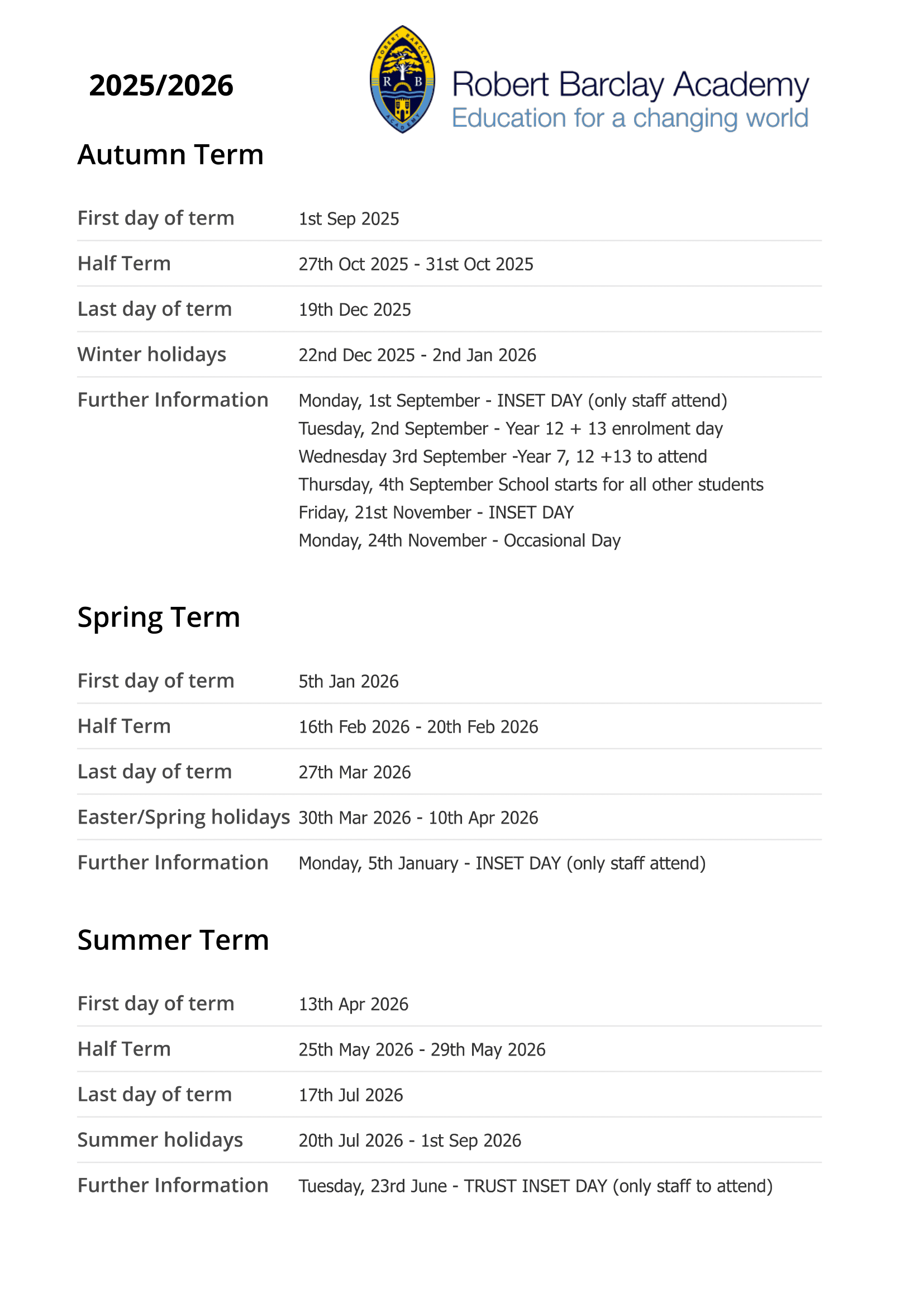 The school Term Dates shown on this page has been sourced directly from the official Robert Barclay Academy term dates website. Please be aware that all dates and events may be amended at the discretion of the school or local council. For the most up-to-date and accurate information, we recommend checking the official council website or contacting the school office.