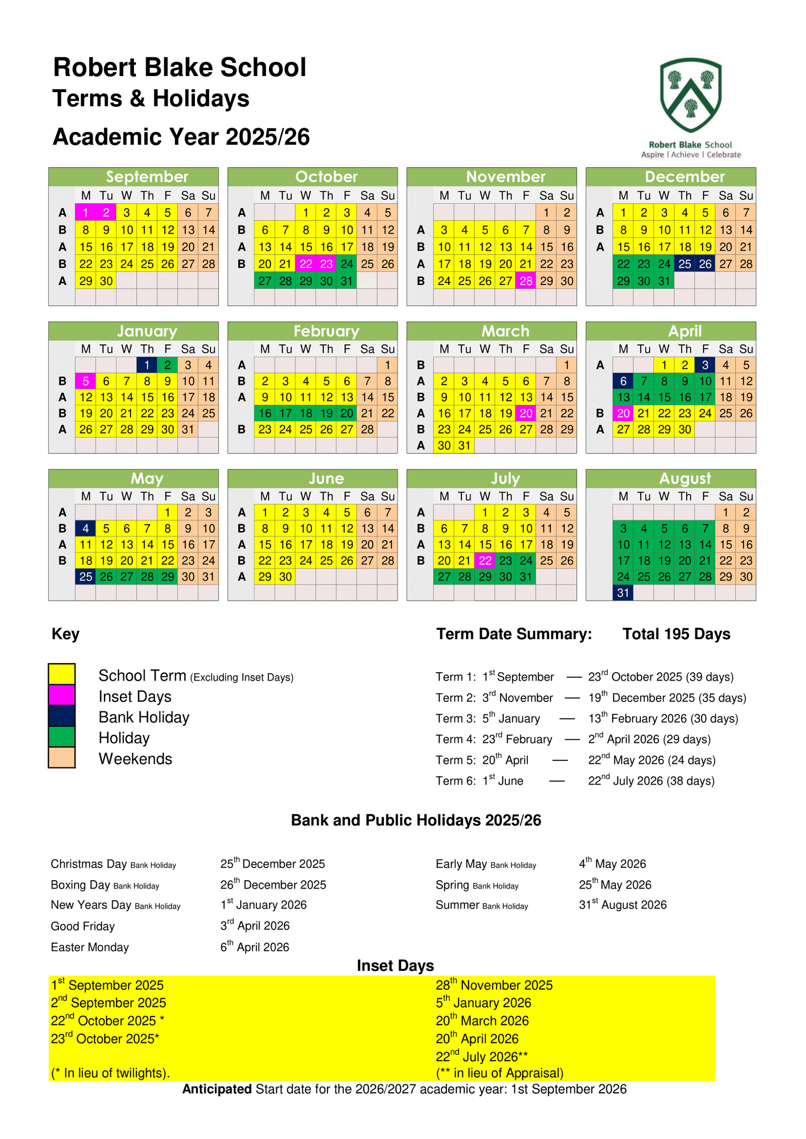 Robert Blake School Term Dates 2025/26