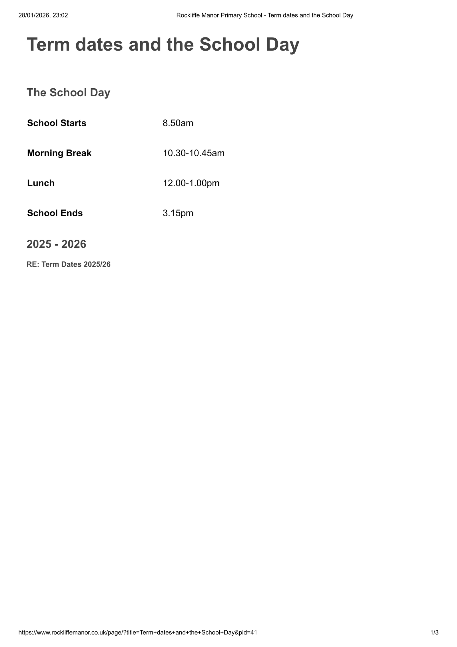 Rockliffe Manor Primary School Term Dates 2025-2026