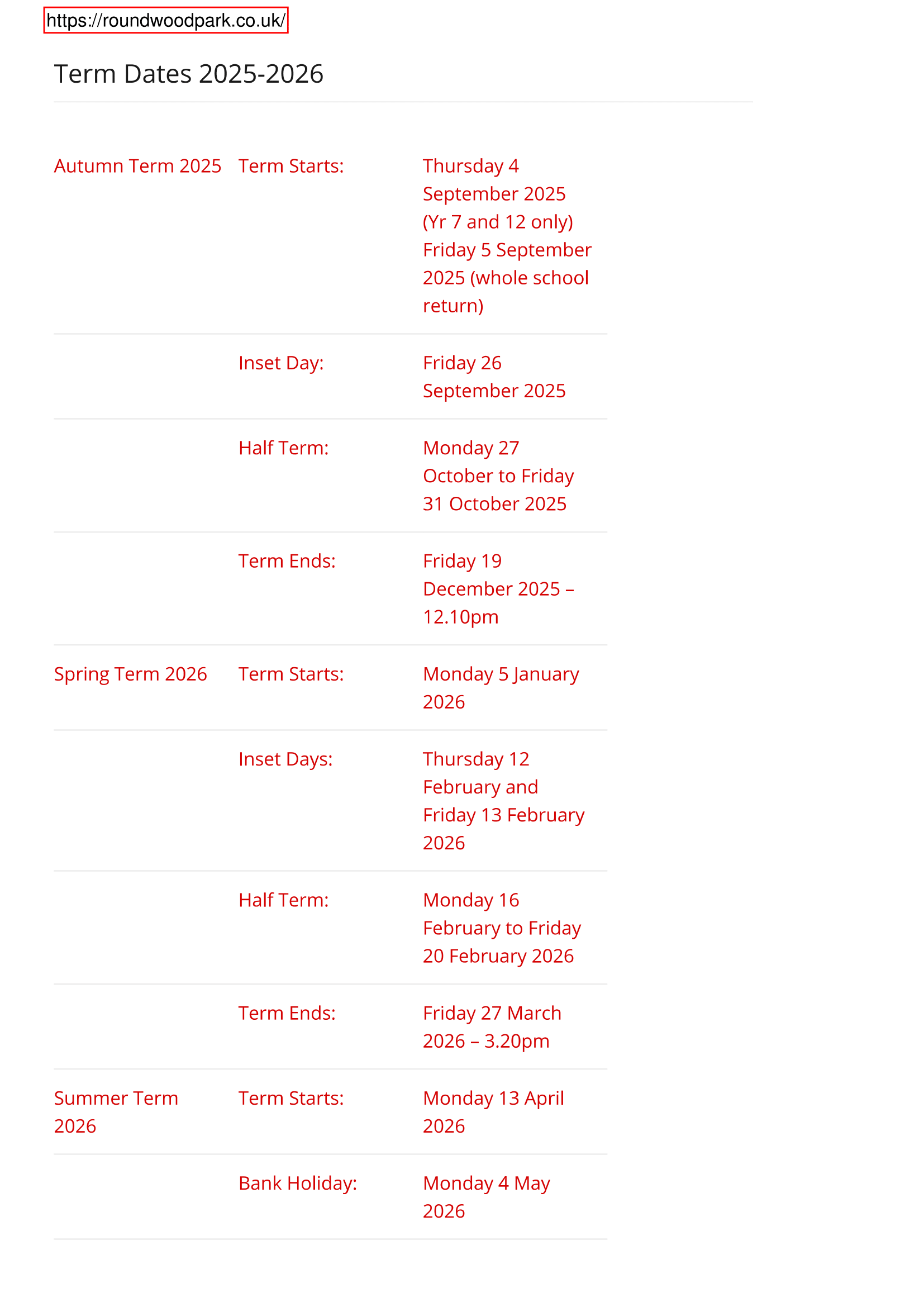 The school Term Dates shown on this page has been sourced directly from the official Roundwood Park School term dates website. Please be aware that all dates and events may be amended at the discretion of the school or local council. For the most up-to-date and accurate information, we recommend checking the official council website or contacting the school office.