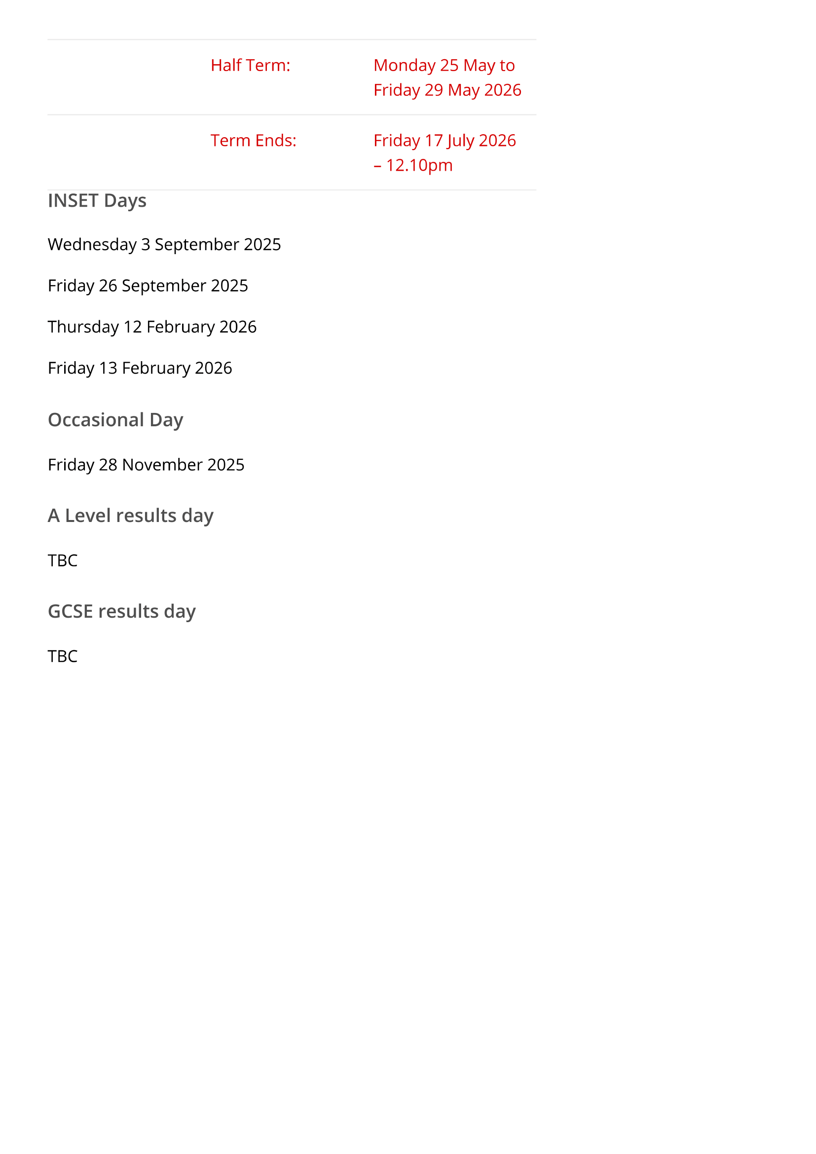 Please read: These dates are taken from the school’s published calendar for 2025–2026. Items reflect the legend categories (term dates, half terms, holidays, bank holidays, and inset days) exactly as shown on the calendar.