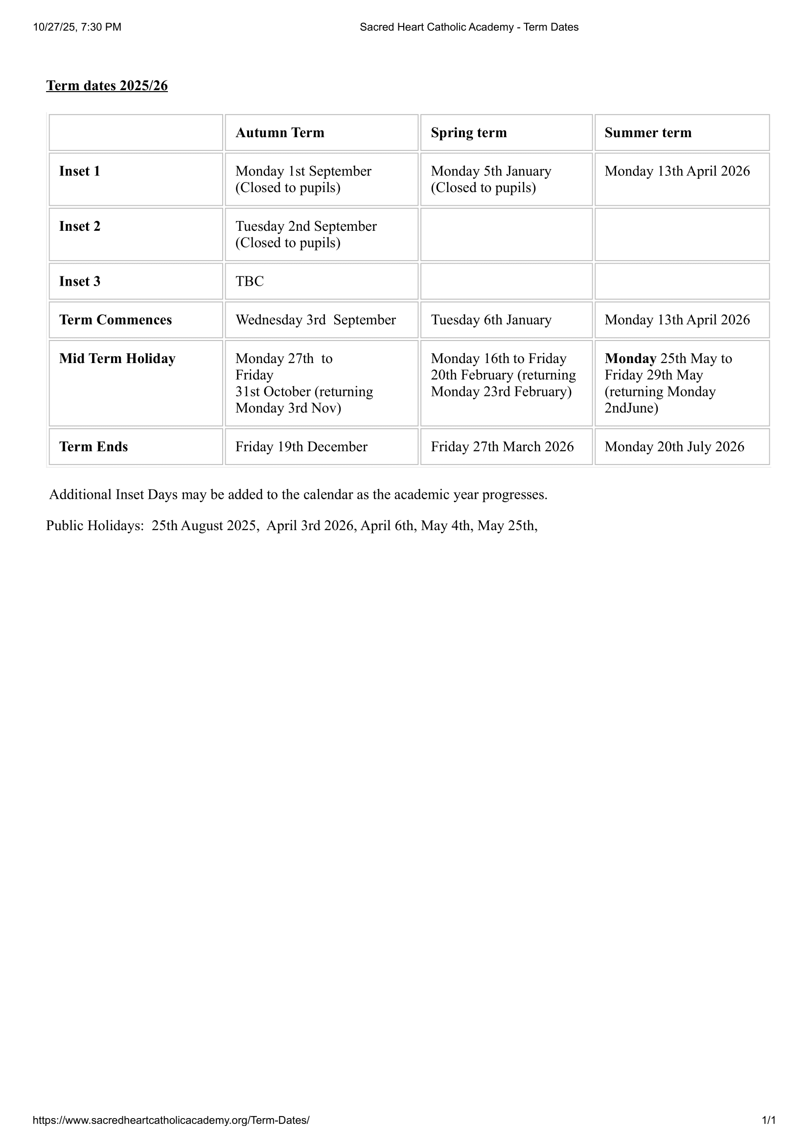 Sacred Heart Catholic Academy Term Dates 2025/26