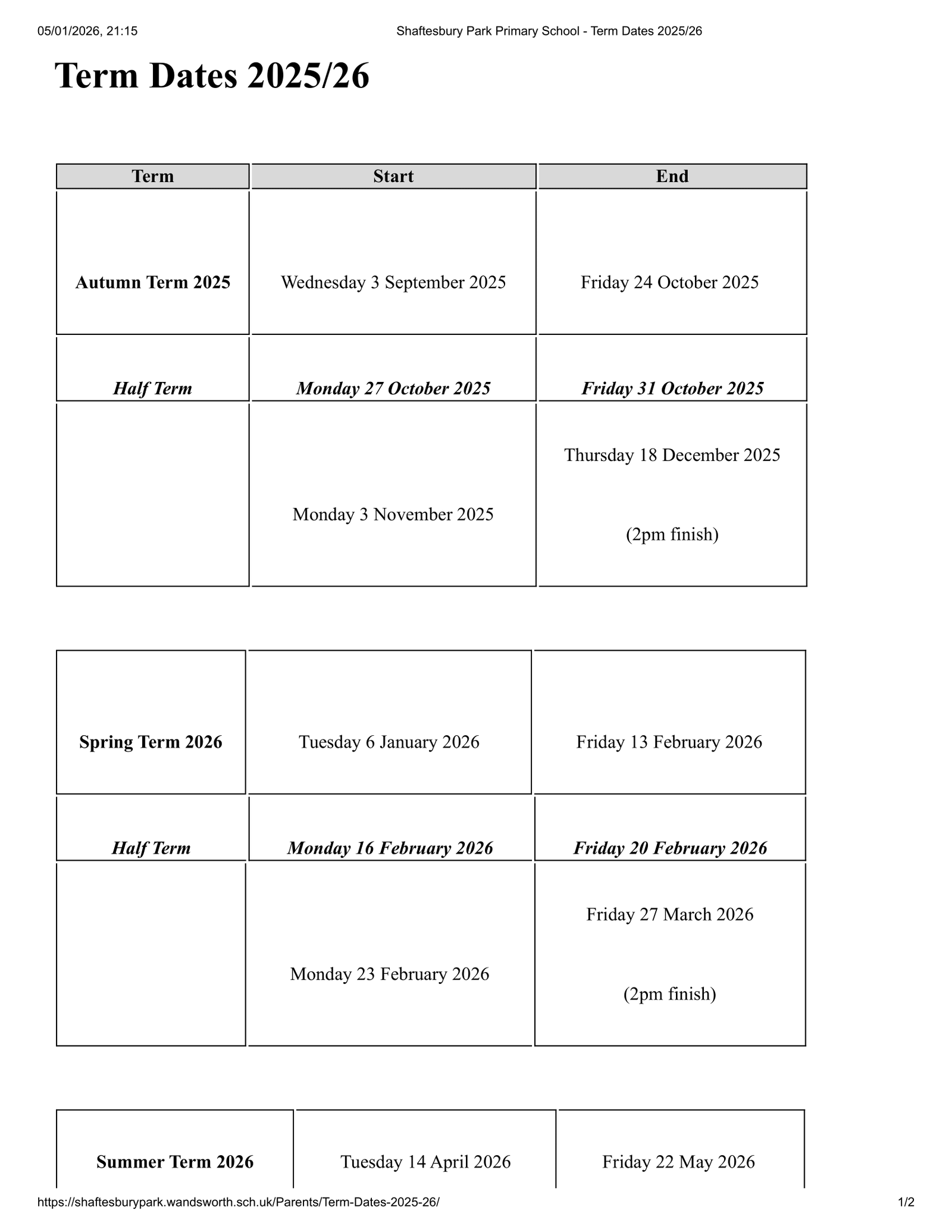 The school Term Dates shown on this page has been sourced directly from the official Shaftesbury Park Primary School term dates 25-26 Official Updates website. Please be aware that all dates and events may be amended at the discretion of the school or local council. For the most up-to-date and accurate information, we recommend checking the official council website or contacting the school office.